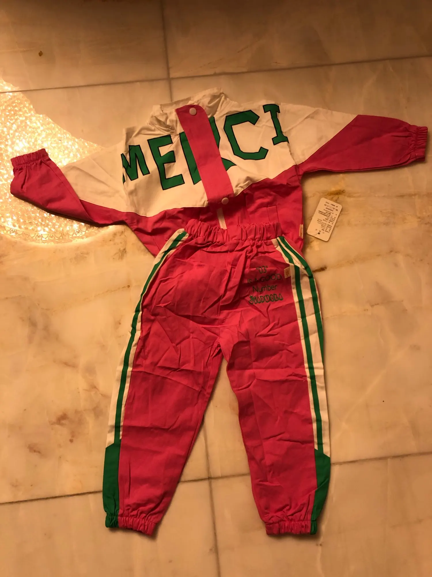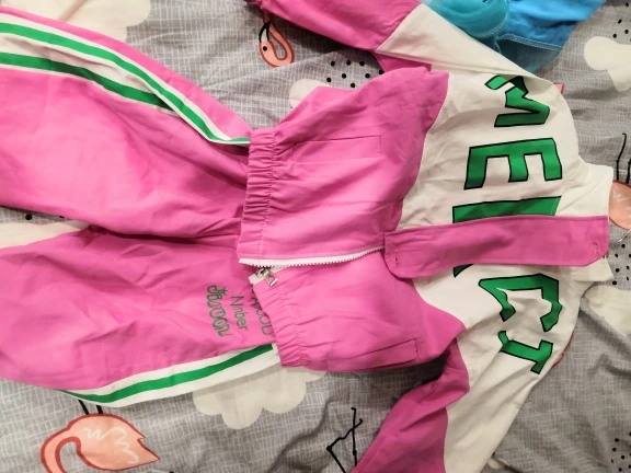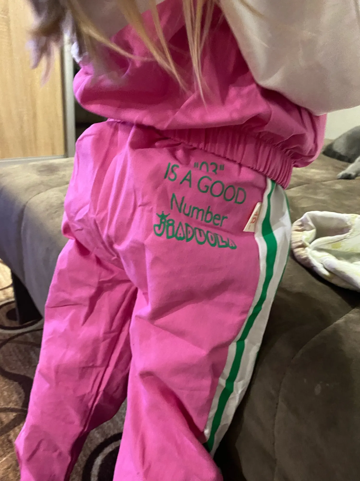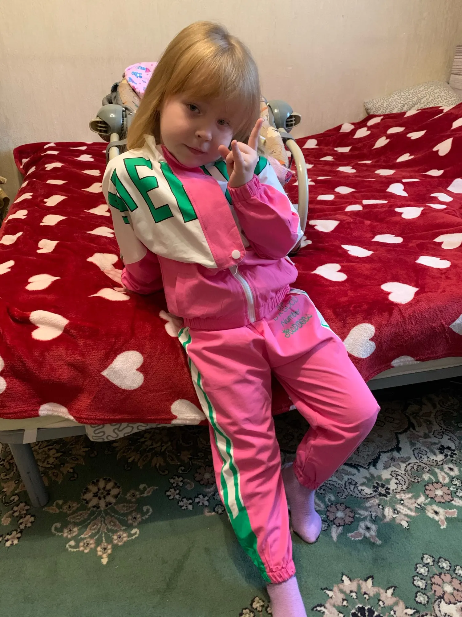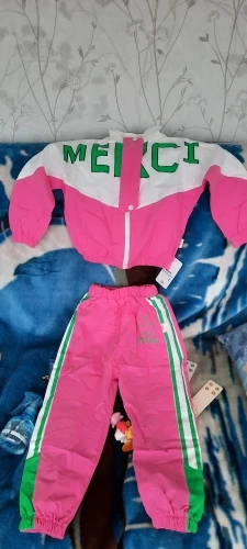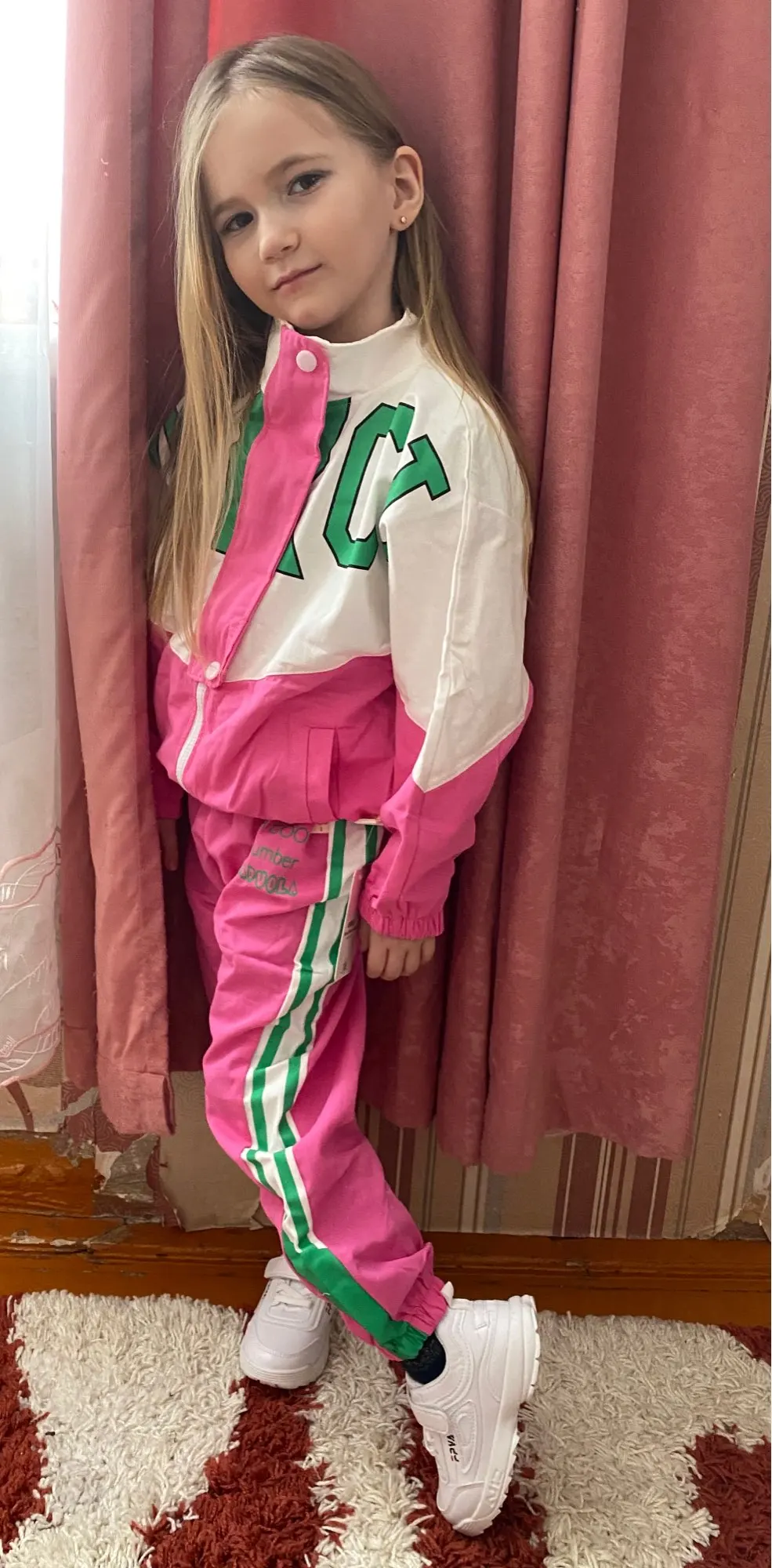 Костюм классный, материал похоже коттон , цвет яркий розовый , на рост 116 , размер 6т впритык по росту . Доставка две недели в Харьков.