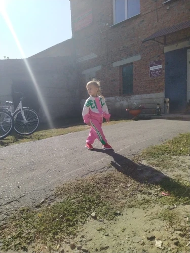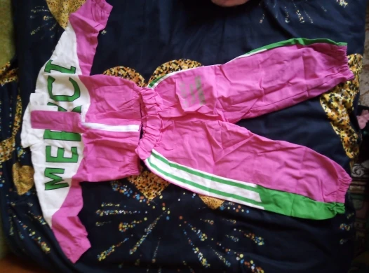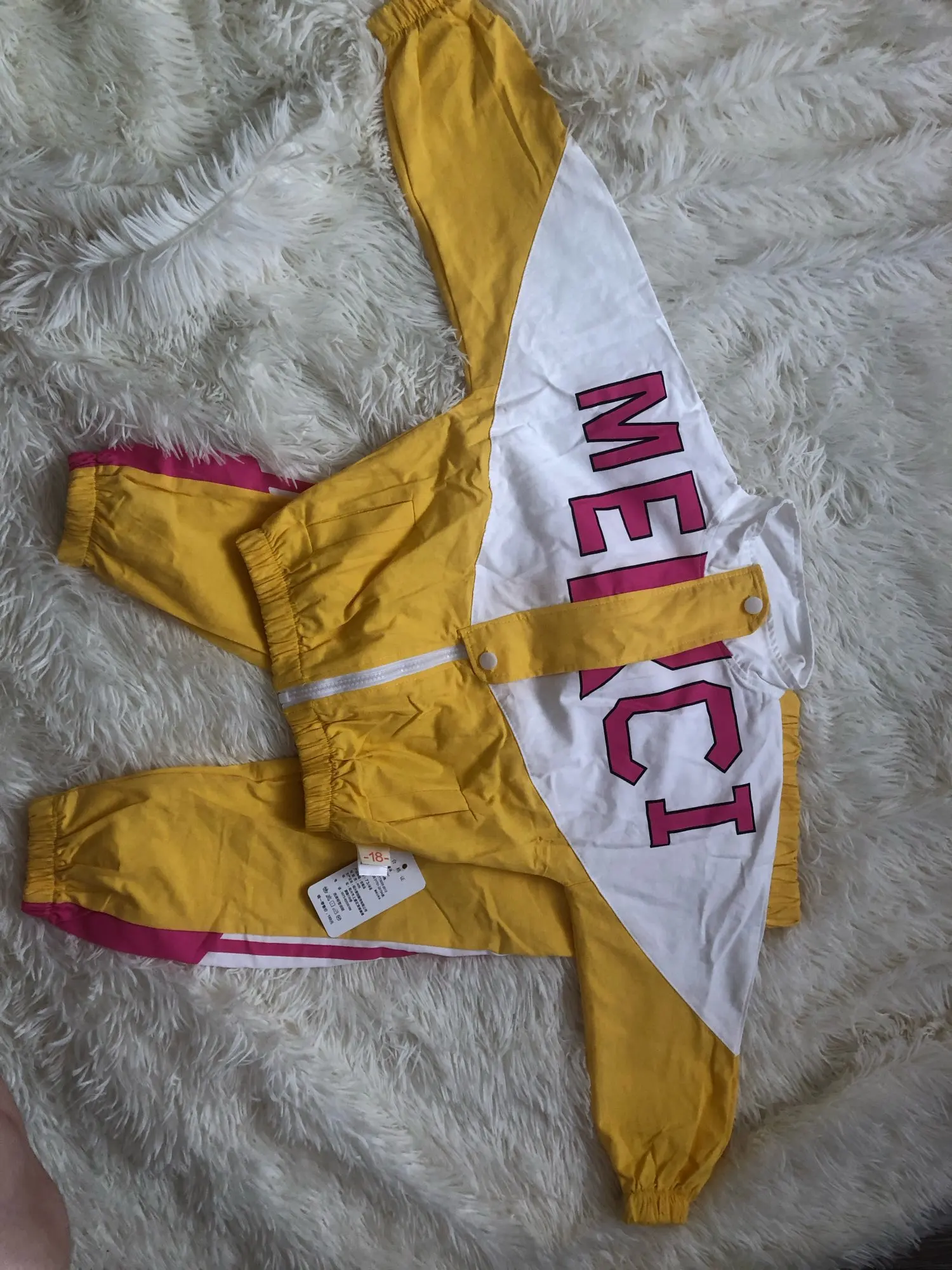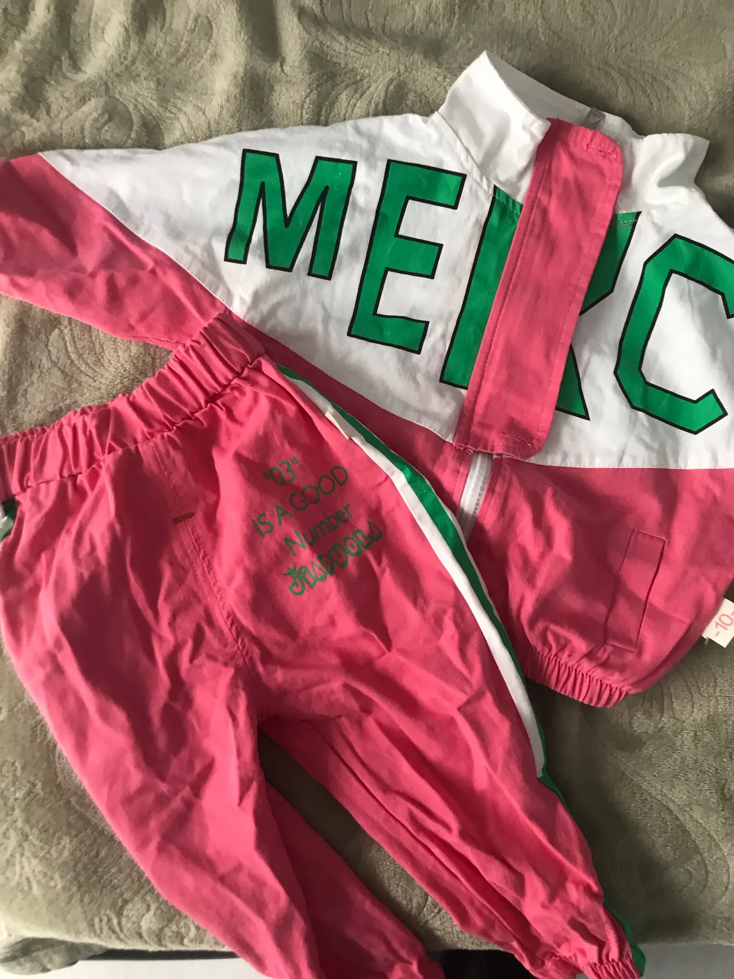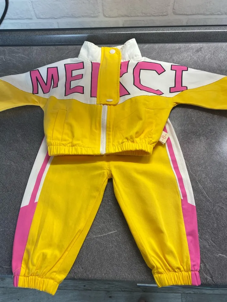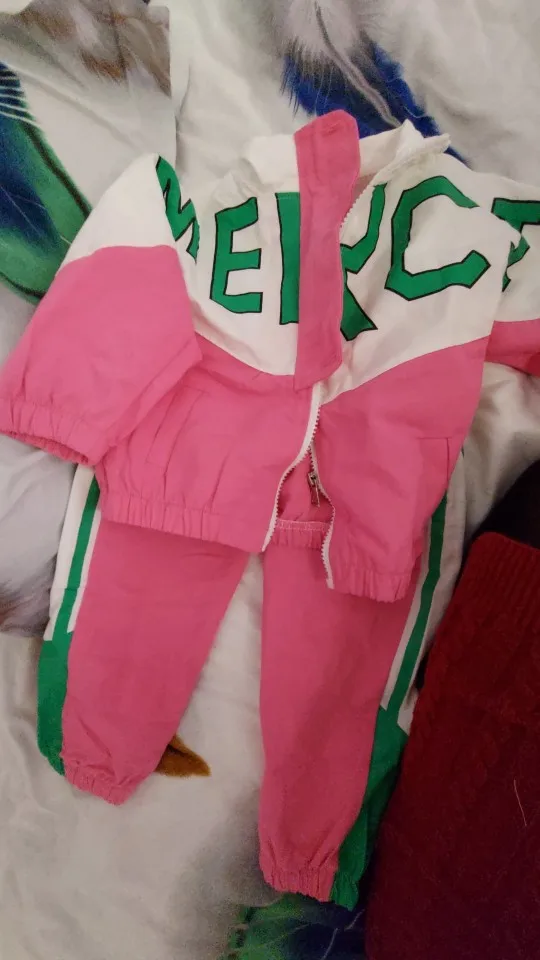 Костюм классный, материал похоже коттон , цвет яркий розовый , на рост 116 , размер 6т впритык по росту . Доставка две недели в Харьков.