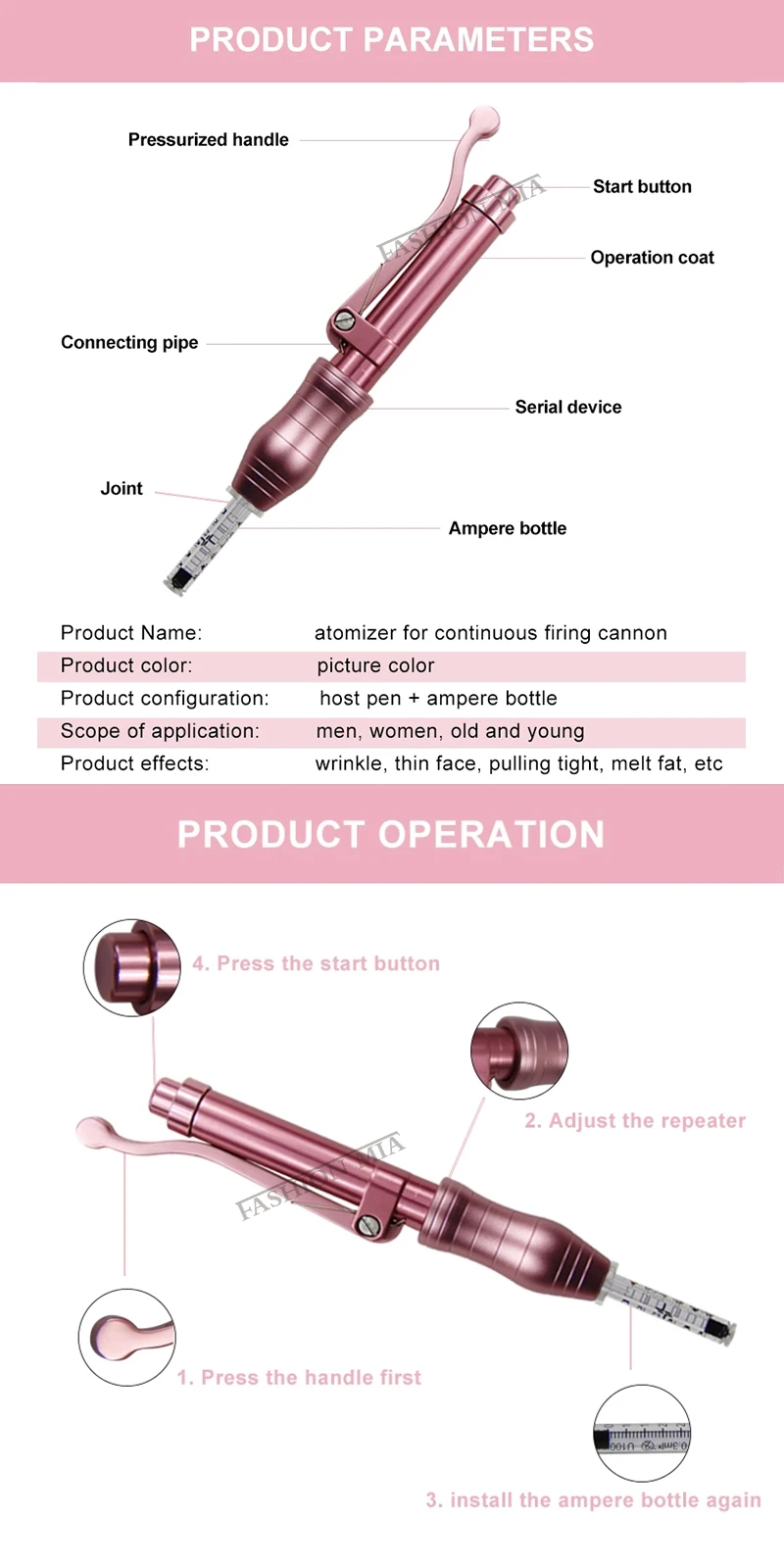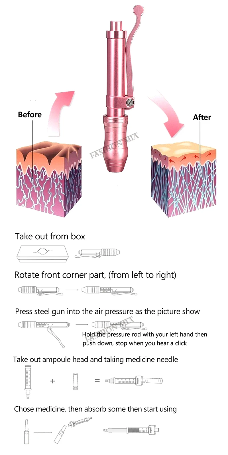 Спецификация: Тип изделия: розовая ручка с гиалуроновой кислотой Цвет: розовый Материал: нержавеющая сталь Количество одной инъекции: 0,05-0,3 мл (5-30IU) Время использования: 2000 раз Глубина впрыска: 4-5 мм Размер: 0,3 мл Объем впрыска: 0,01 мл ~ 0,12 мл (Минимальная шкала 1 кадра составляет 0,01 мл, если вы хотите играть 0,05, то вниз 5 кадров, максимум 12 кадров составляет 0,12 мл, самая большая шкала-0,5 мл) Особенности: 1. Без игл: Многие люди страдали от игольчатой фобии. Наша технология Needle Free уменьшает фобию иглы без необходимости инъекции. 2. Практически без боли: Быстрое впрыск в менее чем 1/3 второго микроотверстия, и автоматизированное пружинное давление делает инъекции с 'sera' практически безболезненными 3. Быстро, легко и безопасно: Он может быть использован больными для самоинъекции, или другие люди могут управлять инъекциями лекарств по рецепту. 4. Нет риска травм иголки: Он устраняет повреждения игл-палок, так как без игл, устраняет затраты на удаление, устраняет перекрестное загрязнение 5. Сопло и адаптер стерилизованы гамма облучением: Они одноразовые, исключая возможность перекрестного загрязнения. 6. Длительный срок службы и низкое обслуживание: Может использоваться для более чем 10000 инъекций и управляется с помощью самодельной пружины.