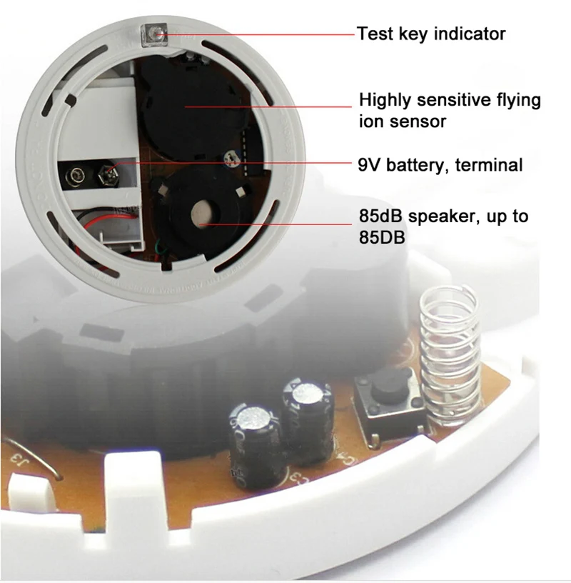 1. Материал: пластик 2. Цвет: белый 3. Датчик: Электрохимический датчик окиси углерода и Инфракрасный фотоэлектрический датчик 4. Рабочая температура: 0-50 °C 5. Рабочая влажность: относительная влажность 10%-95% 6. Содержание окиси углерода при обнаружении газа: 000-999ppm 7. Чувствительность дыма: 0.1% дБ/m-9.9 % дБ/м 8. Мощность: 3 батареи AA1.5V 9. Будильник: ЖК-дисплей, звук и светильник 10. Дисплей батареи: сигнал тревоги низкого заряда батареи 11. Размер: 104 мм (диаметр) * 35 мм (высота) 12. Ток покоя: <80uA 13. Ток сигнала тревоги: <30 мА 14. Звуковая сигнализация:>80 дБ 15. Область защиты детектора дыма: когда высота пространства составляет от 6 до 12 метров, площадь защиты одного детектора составляет 80 квадратных метров для общей площадки защиты; когда высота пространства составляет 6 метров или меньше, площадь защиты составляет 60 квадратных метров. 16. Область применения: барбекю магазин, кухня, спальня, гостиная, парковка, школа, библиотека
