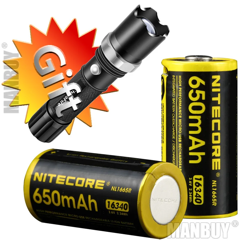 2022 NITECORE 2 шт. NL1665R 650 мАч 16340 CR123 встроенный USB зарядный порт перезаряжаемая литий-ионная батарея 3,6 В Бесплатный подарок фонарик