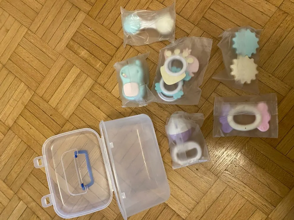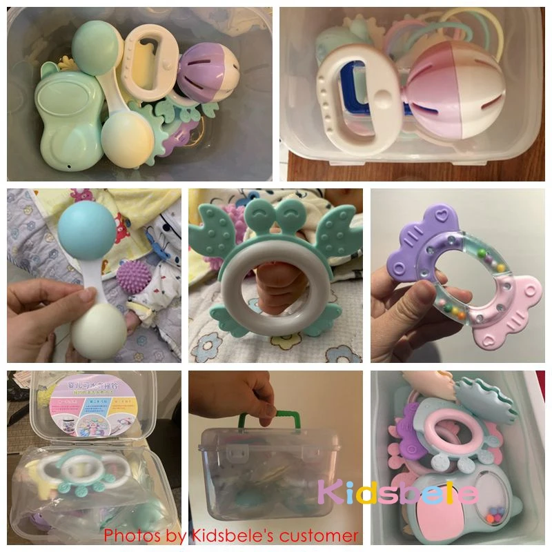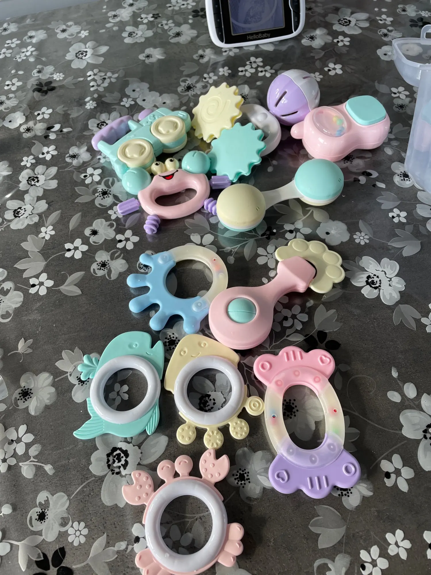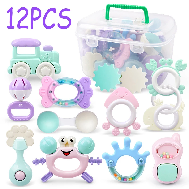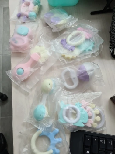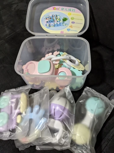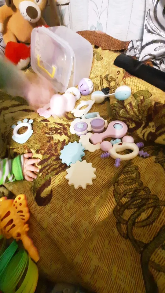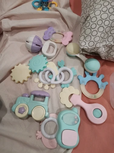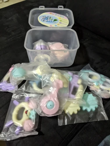 Набор состоит из 12 различных игрушек. Все отлично ложатся в детскую маленькую ручку. Точные размеры можно посмотреть на странице товара. Материал пластик.Все игрушки можно использовать по-разному: есть погремушки, есть пищалки, есть грызунки. Приходят они в индивидуальной упаковке каждая. Представлена единая расцветка - унисекс.Весь набор собран в специальный ящичек с ручкой для удобства хранения. Единственный нюанс, в пути наша коробочка треснула, поэтому продавцу рекомендовала бы упаковывать лучше, игрушке все целые - это главное. Я заказывала в подарок, причем сразу не на свой адрес, поэтому было немного обидненько.Доставка в Беларусь была долгой, потому что первый раз её почему-то вернули, но продавец выслал снова и спустя около 1,5 мес всё же получили. Трек отслеживался на всем пути.