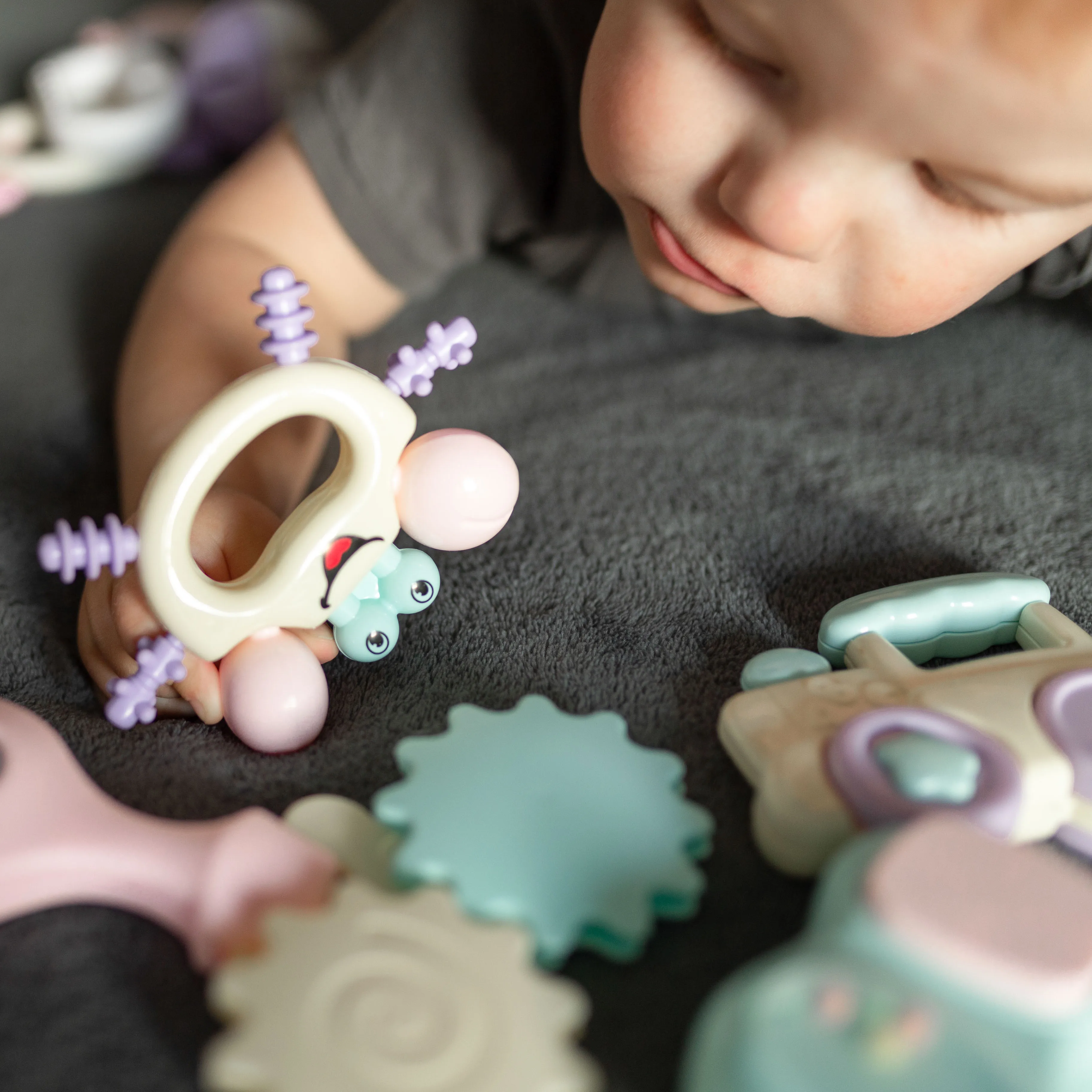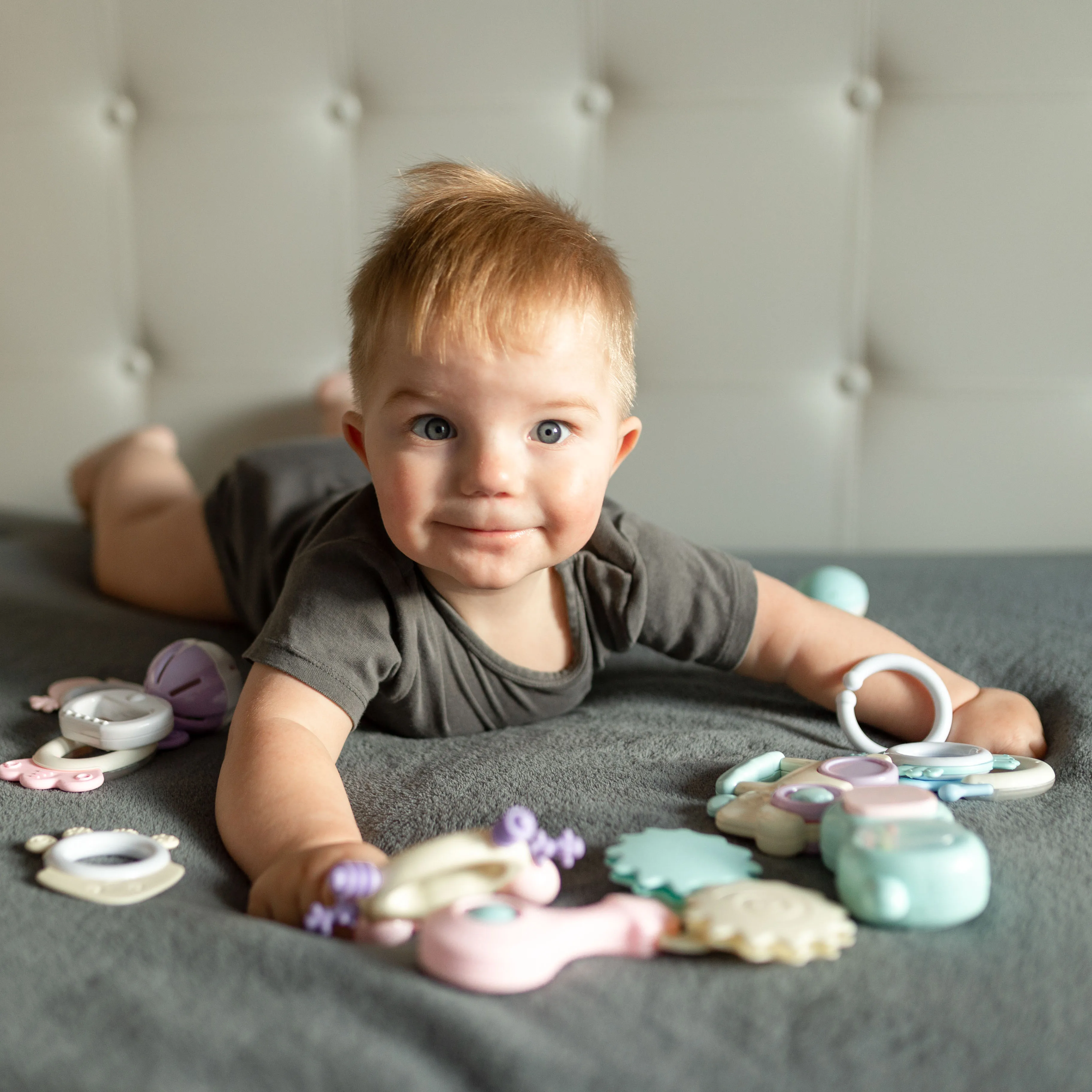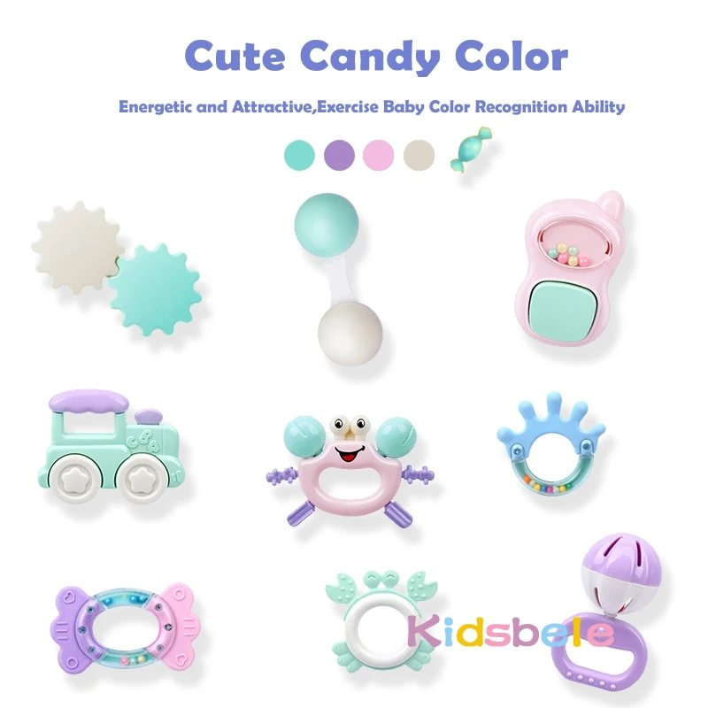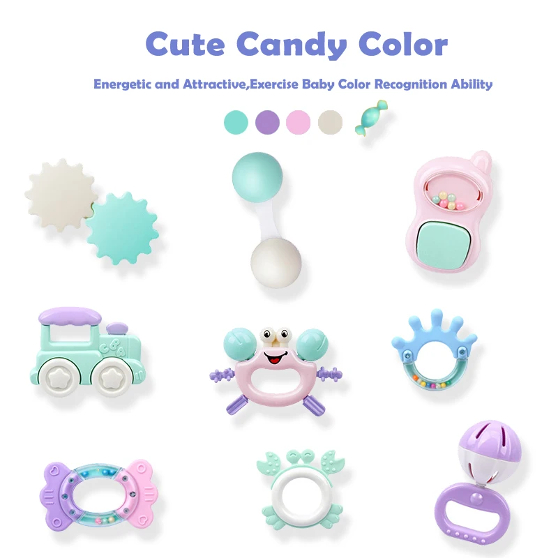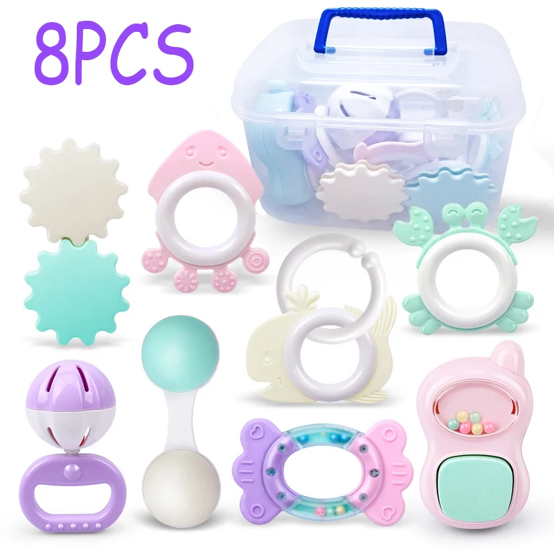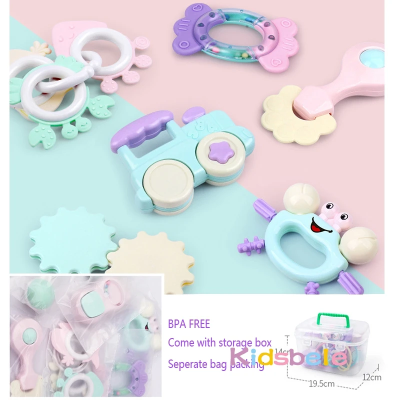 Набор состоит из 12 различных игрушек. Все отлично ложатся в детскую маленькую ручку. Точные размеры можно посмотреть на странице товара. Материал пластик.Все игрушки можно использовать по-разному: есть погремушки, есть пищалки, есть грызунки. Приходят они в индивидуальной упаковке каждая. Представлена единая расцветка - унисекс.Весь набор собран в специальный ящичек с ручкой для удобства хранения. Единственный нюанс, в пути наша коробочка треснула, поэтому продавцу рекомендовала бы упаковывать лучше, игрушке все целые - это главное. Я заказывала в подарок, причем сразу не на свой адрес, поэтому было немного обидненько.Доставка в Беларусь была долгой, потому что первый раз её почему-то вернули, но продавец выслал снова и спустя около 1,5 мес всё же получили. Трек отслеживался на всем пути.