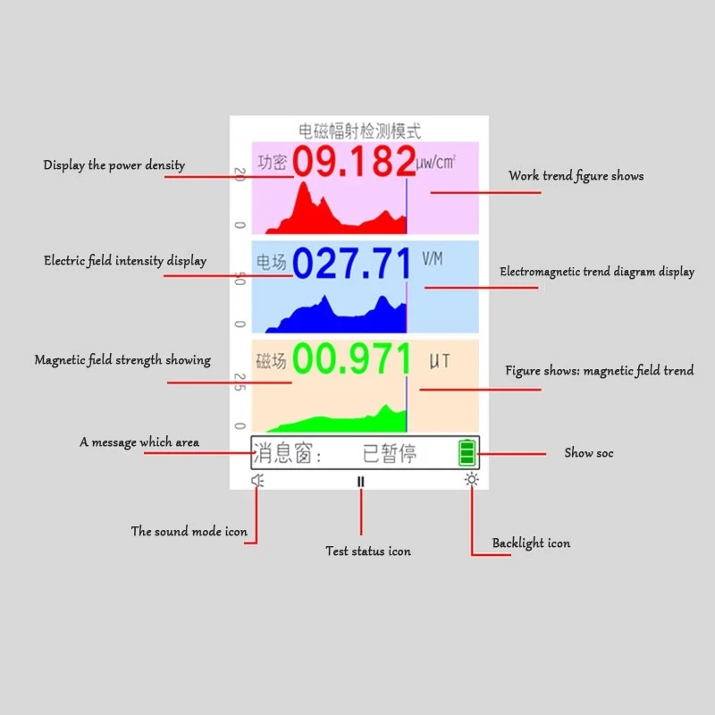 Пожалуйста, покупайте в соответствии с вашими потребностями, если у вас есть какие-либо вопросы, пожалуйста, свяжитесь с нашим магазиномХарактеристики:Материал: АБС-пластикЦвет: синийМодель: BR-9AЭкран Размер: 57*43 мм/2,2 * 1.7inДиапазон испытаний:Мощность Плотность: 0-99.999μw/c㎡Интенсивность электрического поля: 0-999,99 в/мИнтенсивность магнитного поля: 0-99.999μTТочность теста:Мощность Плотность: 0,001 мкВт/c㎡Напряженность электрического поля: 0,01/мИнтенсивность магнитного поля: 0.001μTЧастотный диапазон:Плотность мощности: 50 МГц-5 ГГцИнтенсивность электрического поля: 20 Гц-100 МГцИнтенсивность магнитного поля: 20 Гц-1 МГцБатарея: 3 * AA (не включены) 1,5 V Батарея или 3*1,2 V аккумуляторная Батарея (не входит в комплект)Зарядка: USB 5V 2A входВремя зарядки: ≥ 4 часаРазмер изделия: 105*70*30 мм/4,1*2,8 * 1.2inВес товара: 100 г/3,5 унцииРазмер посылка: 150*100*55 мм/5,9*3,9 * 2.2inПосылка Вес: 165 г/5,8 унцииПосылка:1 * Детектор электромагнитного излучения1 * Руководство пользователя