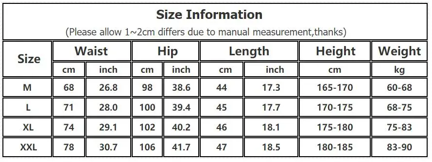 1. Дорогой друг, спасибо за покупку подарков в нашем магазине. Пожалуйста, не забудьте указать свое полное имя, подробный адрес, почтовый индекс, номер телефона. Чтобы вы могли успешно получить свою посылку. 2. Перед покупкой сверьтесь с таблицей размеров ниже. Если ваши мерки колеблются между двумя размерами, советуем выбрать больший размер. Если вы не уверены в размере, пожалуйста, оставьте мне сообщение о вашем весе и росте, я могу дать вам предложение. Примечание: возможны отклонения на 0,5-1 дюйм из-за ручного измерения. (1 дюйм = 2,54 см) Цвет фактического товара может незначительно отличаться от цвета на изображениях выше из-за разных экранов компьютера. Спасибо за понимание.