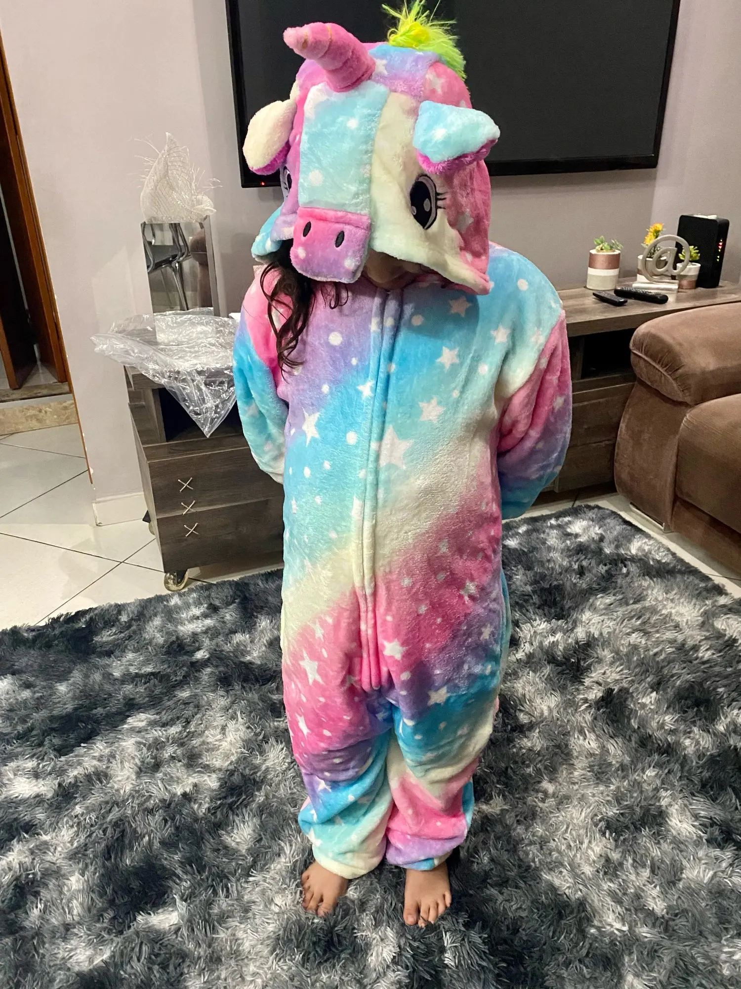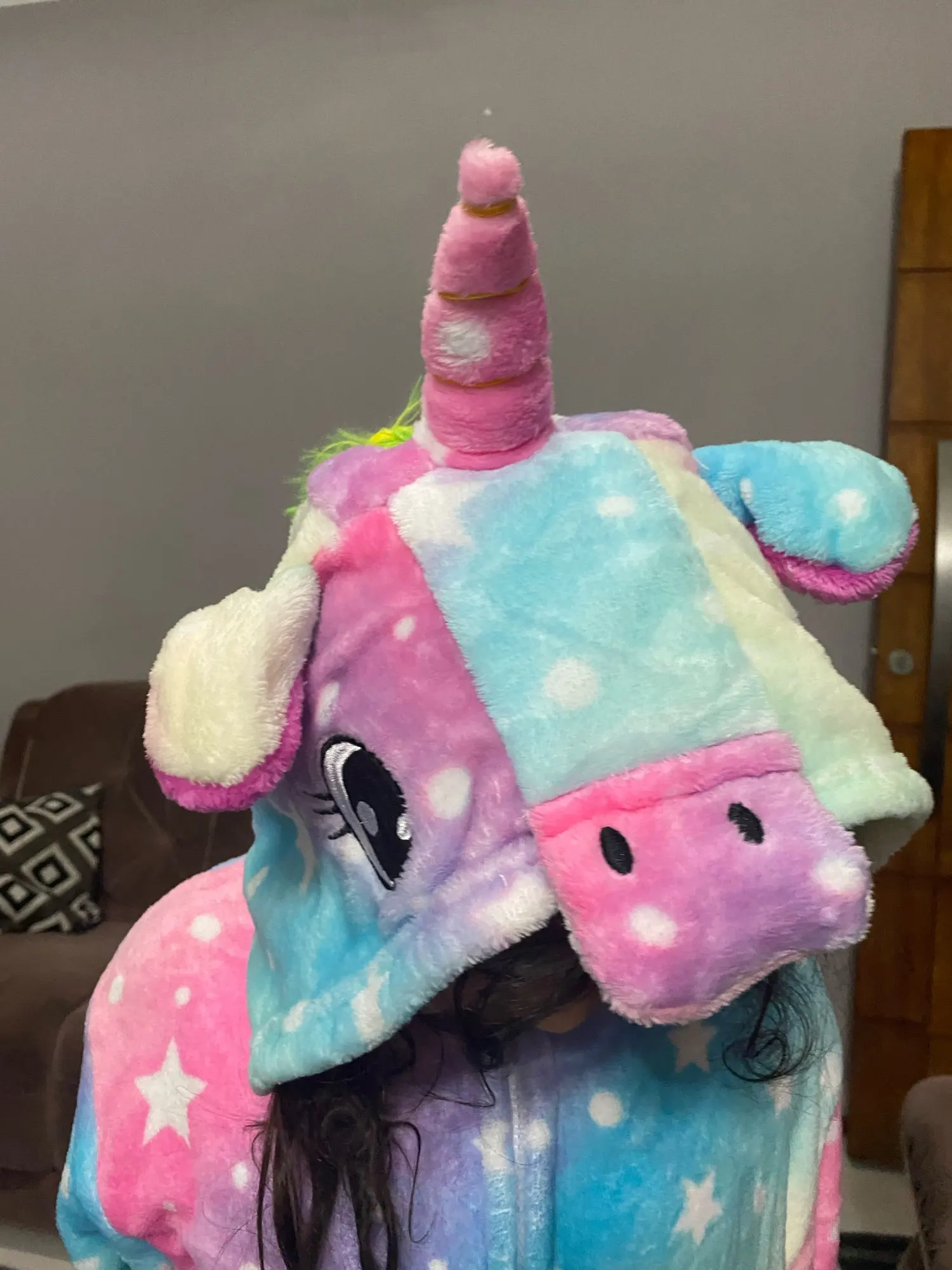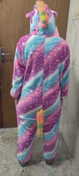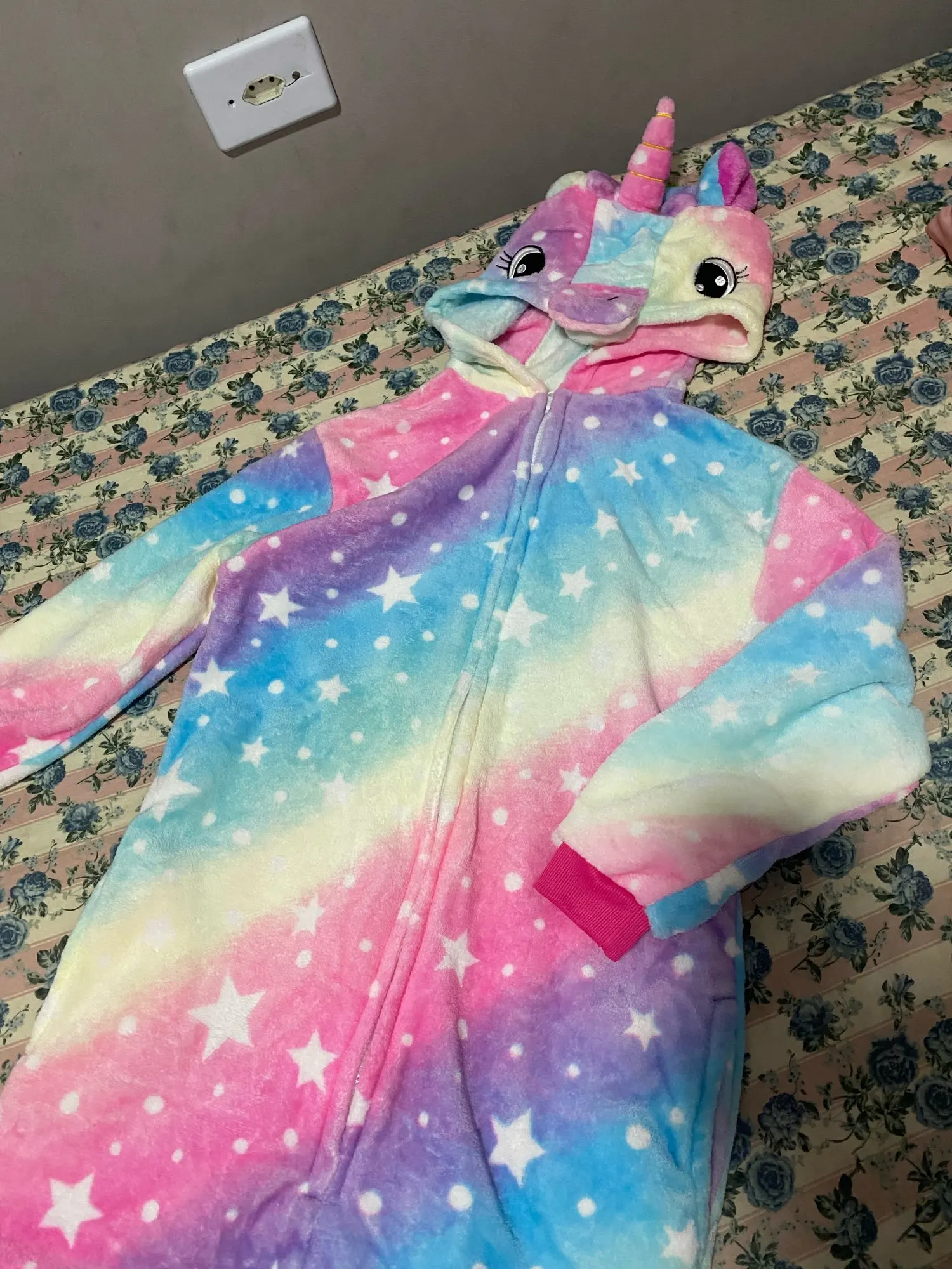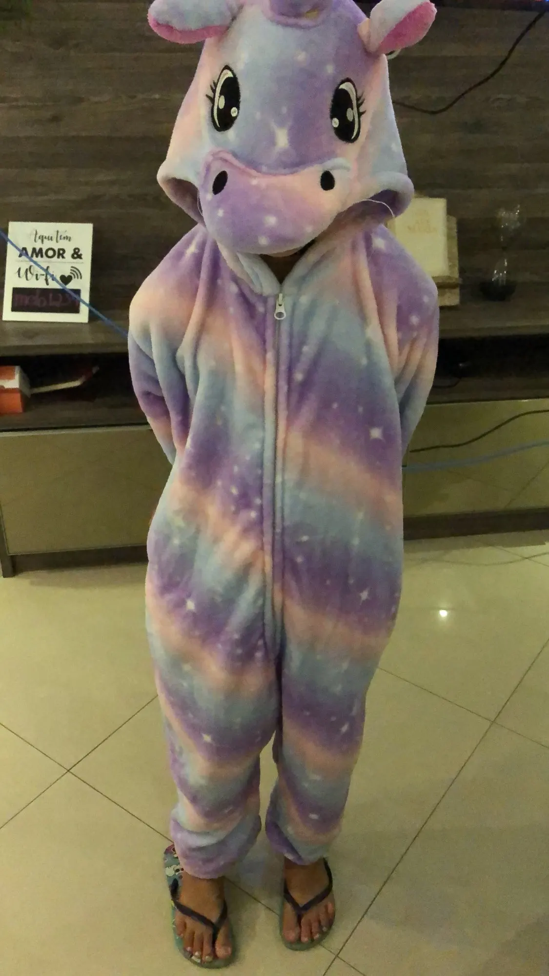 Descrição bem precisa, chegou bem embalado, antes do prazo, muito rápido, bem costurado, fechamento com zíper, o zíper funcionando muito bem, tem bolsos, tecido bem macio ao toque, minha filha está encantada, usa número 14, acabei comprando m adulto, o corpo realmente é bem comprido, mas os punhos e braços ficaram ótimos, para dormir está ótimo, muito feliz com a peça, comprarei mais, ótimo custo x beneficio, super recomendo!