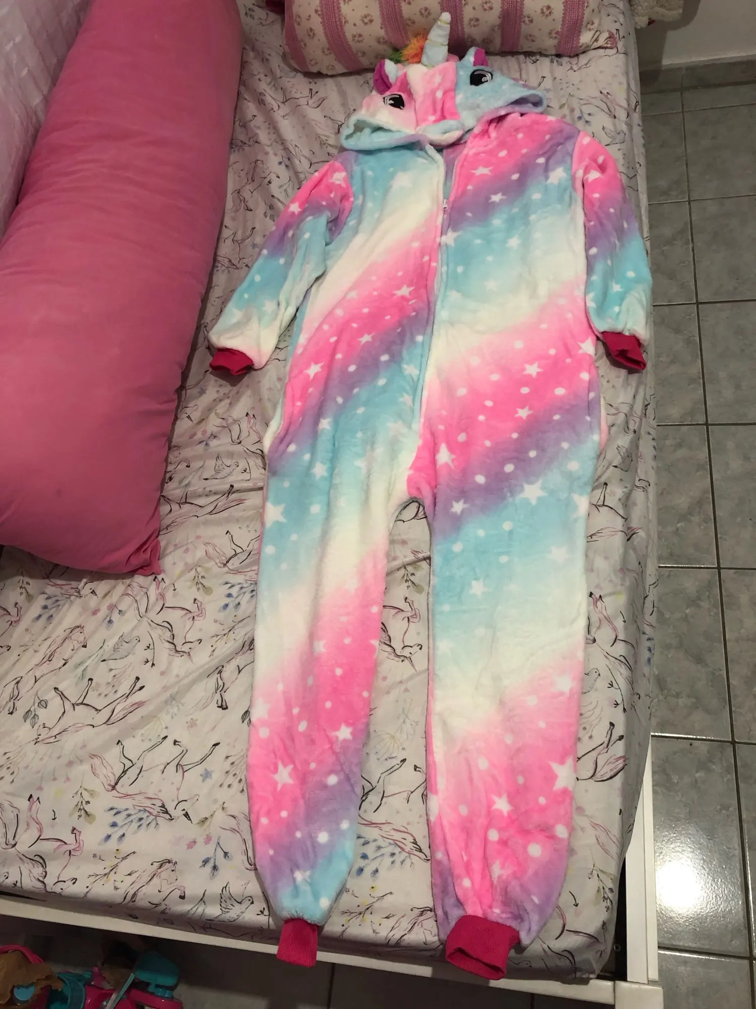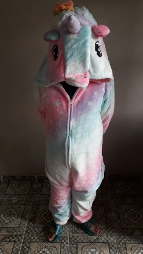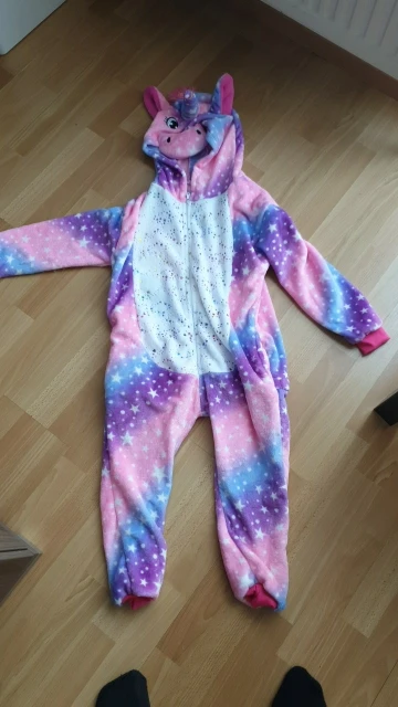 Размеру соответсвует, мягкий и теплый, без постороннего запаха. Молния на попе для похода в туалет сомнительное удовольствие, но все лучше чем мести пол капюшоном при полном снятии. Ребенок счастлив и сразу самый прекрасный единорог на всем белом свете! Продавца и товар рекомендую;)