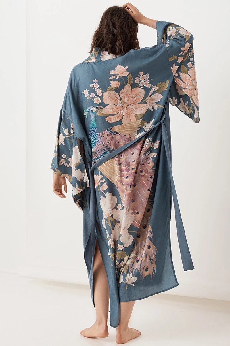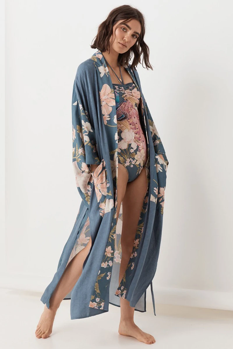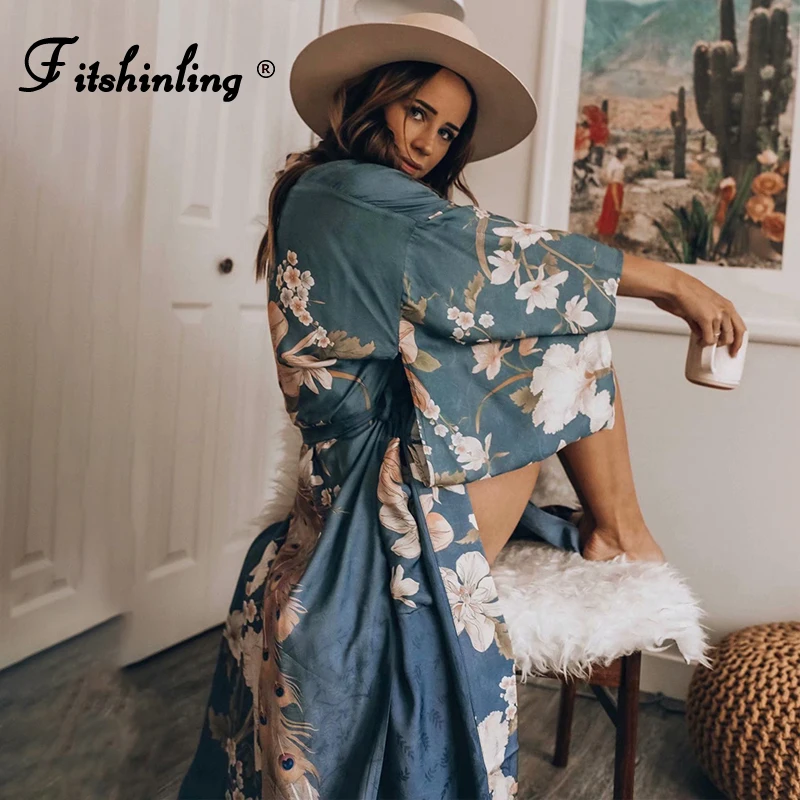 Пляжное кимоно Fitshinling, с расклешенными рукавами, с поясом, разрезом по бокам, принтом и карманами, тонкий длинный кардиган, накидка для отдыха, осенняя одежда