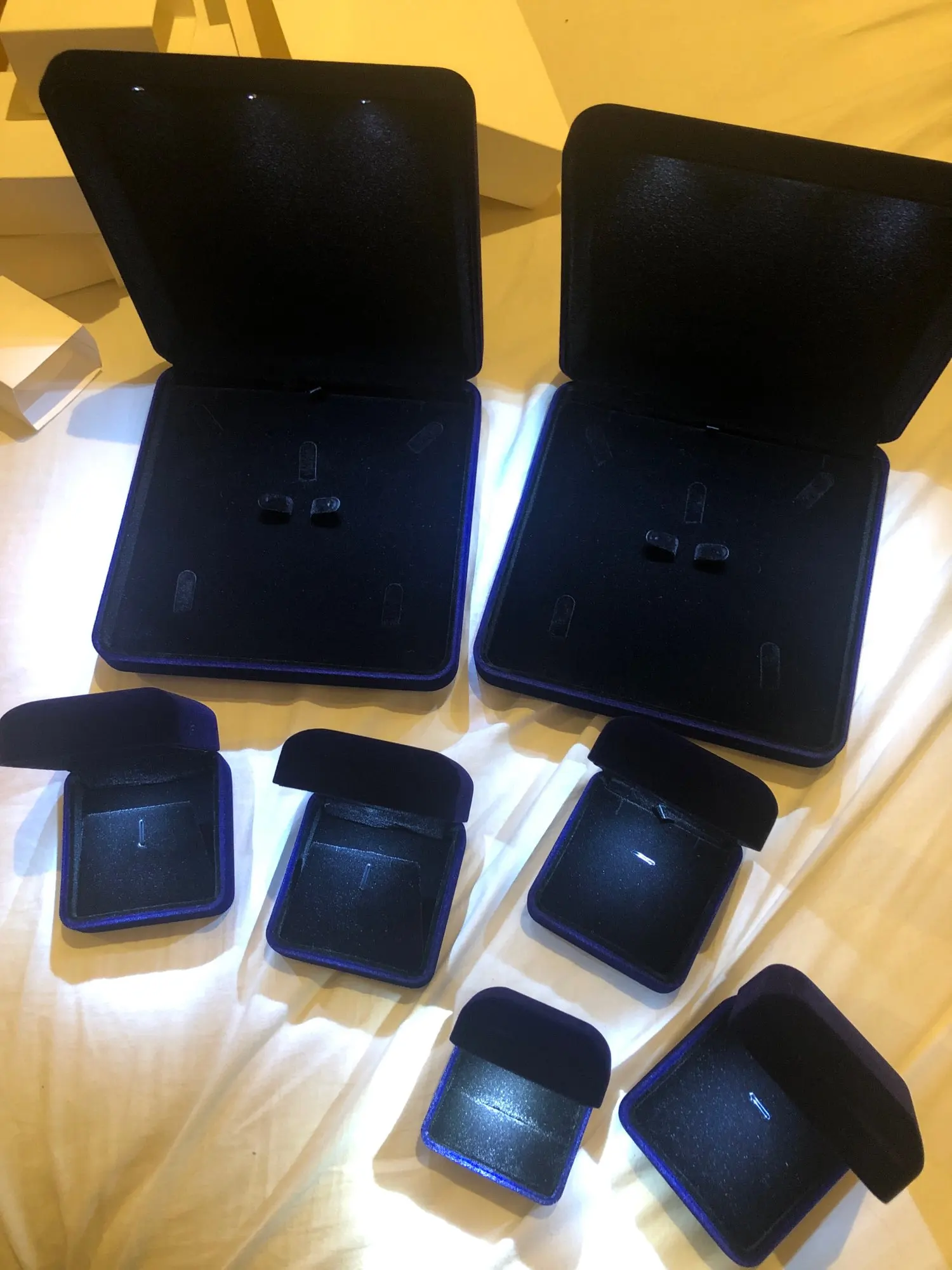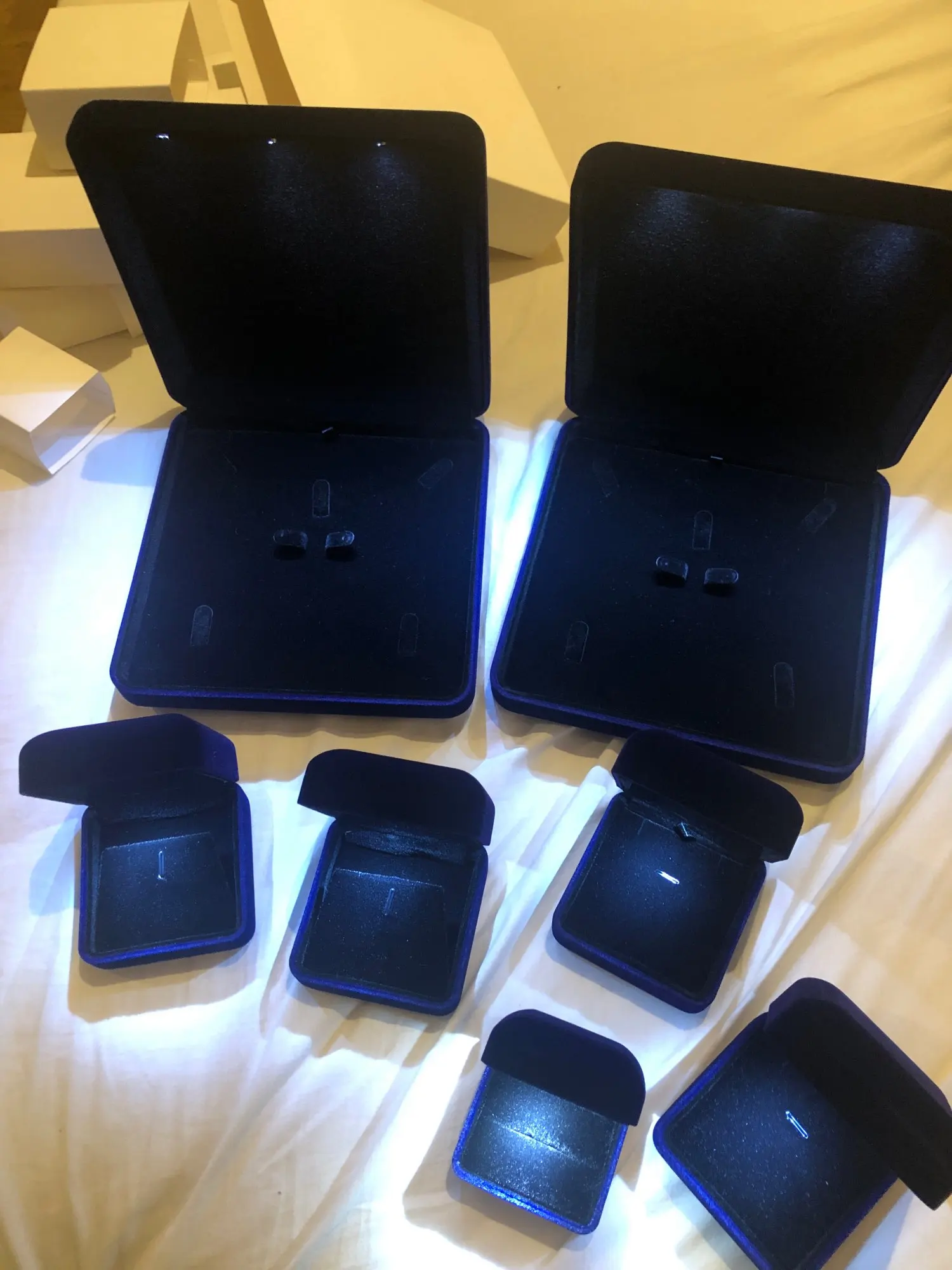 Красивые коробки, Они тяжелые, поэтому отличного качества. Я заказал 2 !! (5 других отдельных коробок для ожерелий, сережек и колец). Все было в идеальном состоянии, все светодиоды были функциональными. Синий цвет красивый, но просто обидно, что внутренняя часть коробок черная; Было бы лучше в более светлом цвете (белый/бежевый). Отзывчивый продавец, доставка примерно через 2 недели, идеальная упаковка. Спасибо!!