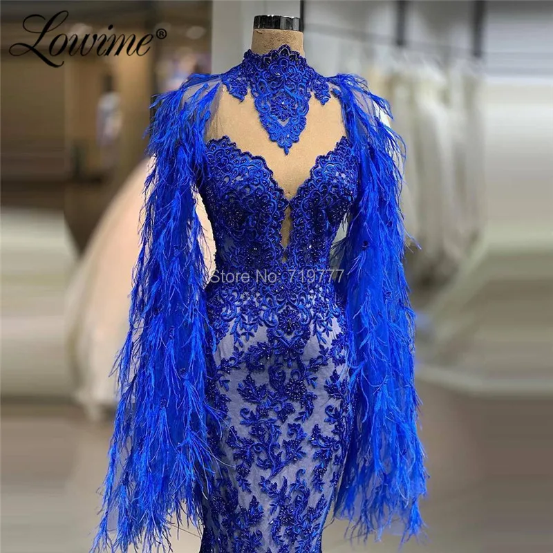 Женское кружевное платье с перьями, вечернее платье синего цвета, расшитое бисером, для Ближнего Востока, 2020