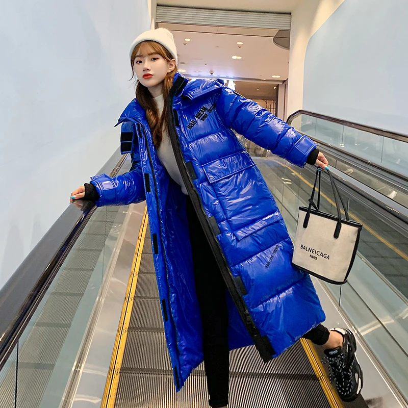Пальто женское зимнее с капюшоном, длинное, блестящее, плотное, 2021