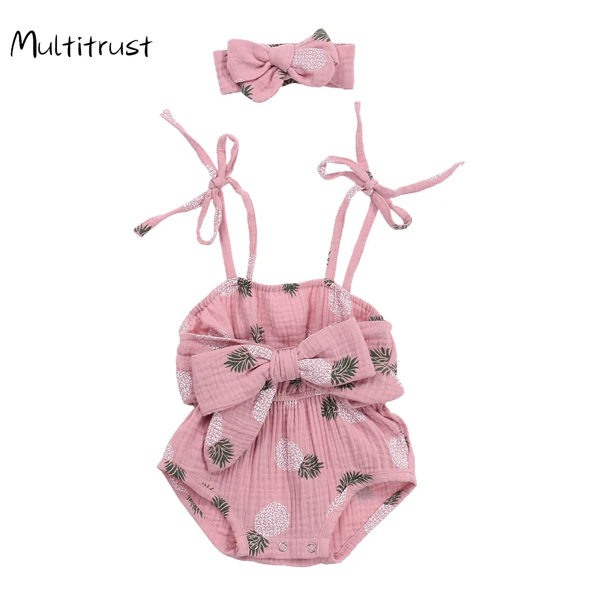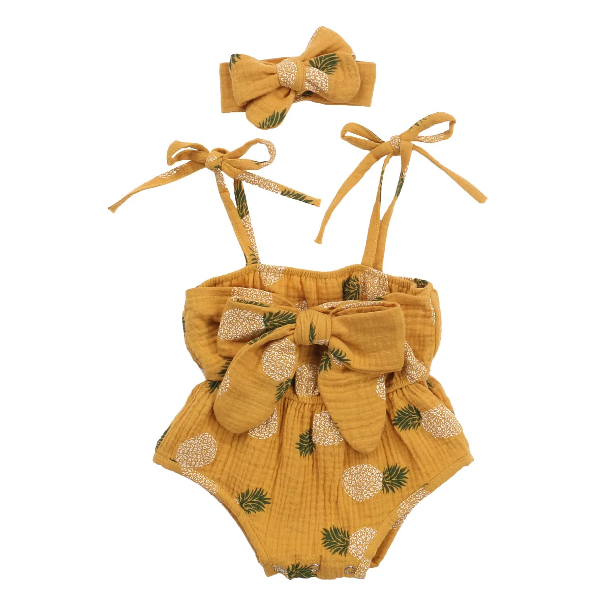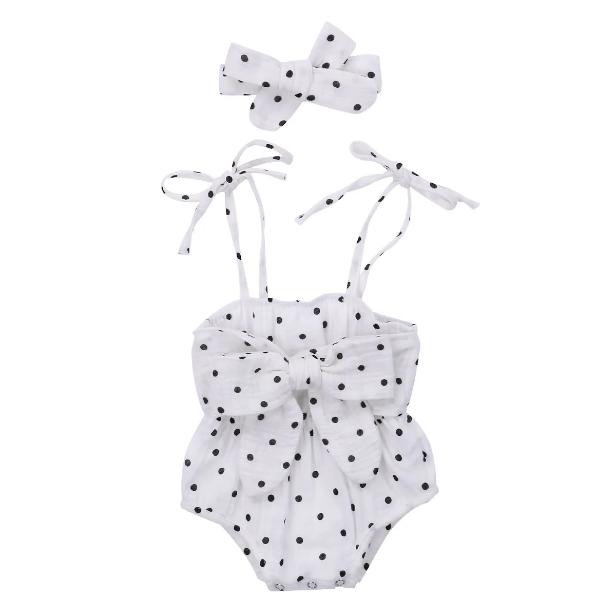 Комбинезоны для маленьких девочек, летние комбинезоны в горошек с бантом и цветочным принтом для новорожденных девочек, повязка на голову, 2 шт., наряды