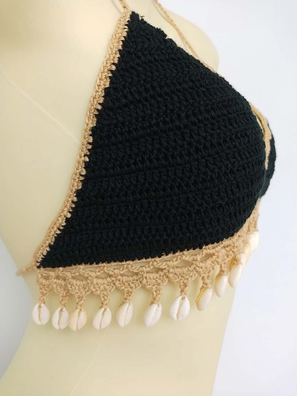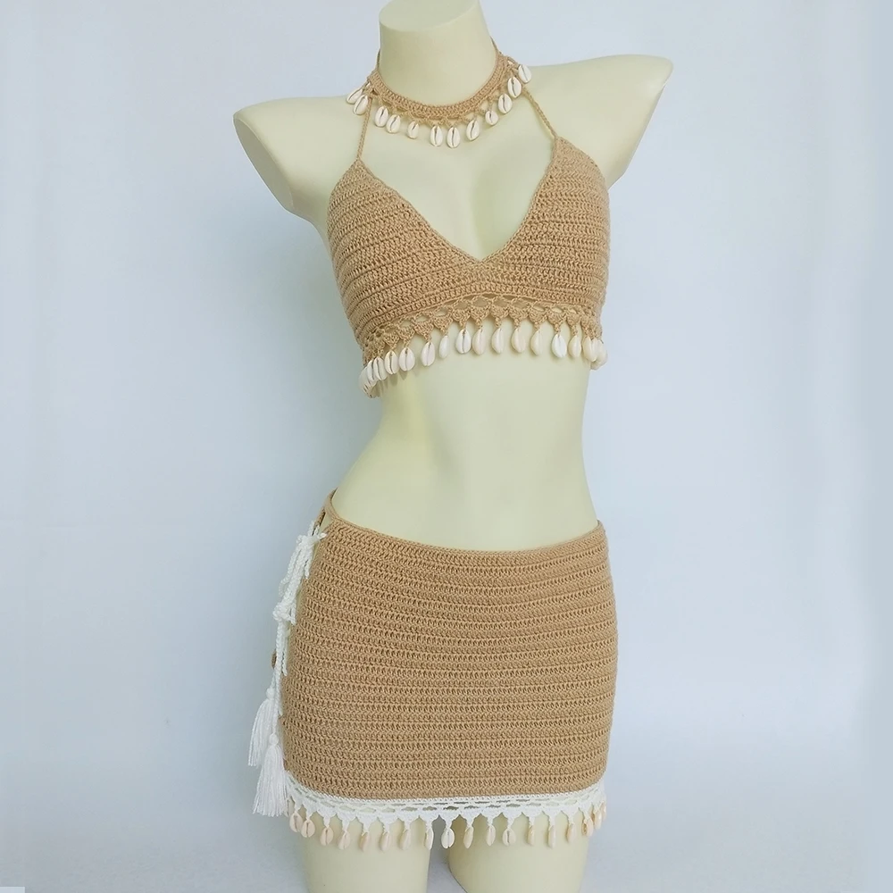 Комплект бикини женский из 3 предметов, ракушка с кисточками, вязаный крючком Топ, пикантная пляжная юбка, кружевная Прозрачная облегающая мини-юбка и ожерелье из ракушек