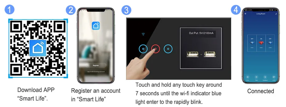 1. Загрузите приложение Smart Life, зарегистрируйте учетную запись и Войдите в систему2. Нажмите «+» в правом верхнем углу-Добавьте вручную-электрик-переключатель (Wi-Fi).3. Сенсорный экран и удерживайте нажмите клавишу заказа занимает около 7 секунд, пока индикатор Wi-Fi синий светильник для электрической фритюрницы (частое мигание.4. Нажмите «Подтвердить светильник быстро мигает ", а затем введите правильный пароль Wi-Fi (2,4 ГГц Wi-Fi)5. В течение 30 секунд, он будет подключен.