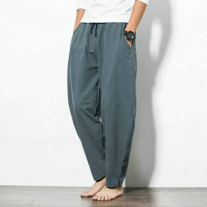 Брюки мужские хлопково-льняные, уличная одежда, свободные прямые штаны, модные однотонные брюки-султанки, лето 2022