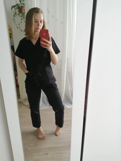 отличный костюм. пошив качественный. синтетика но хорошего качества. 35 хлопок 65 полиэстер. ношу размер М но из-за груди взяла L, думаю можно было и М брать, но побоялась что в груди будет узко.