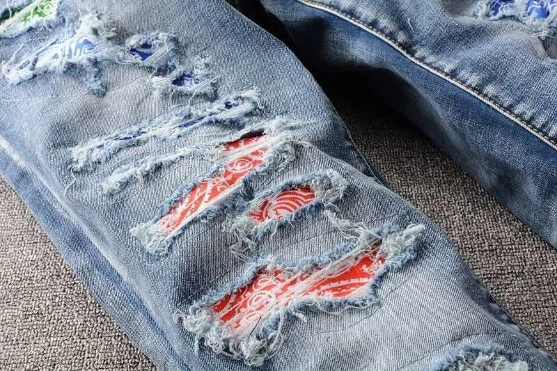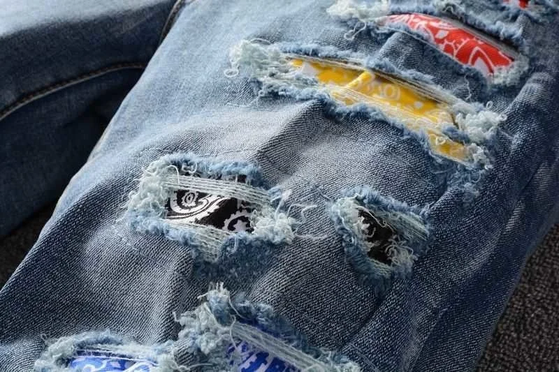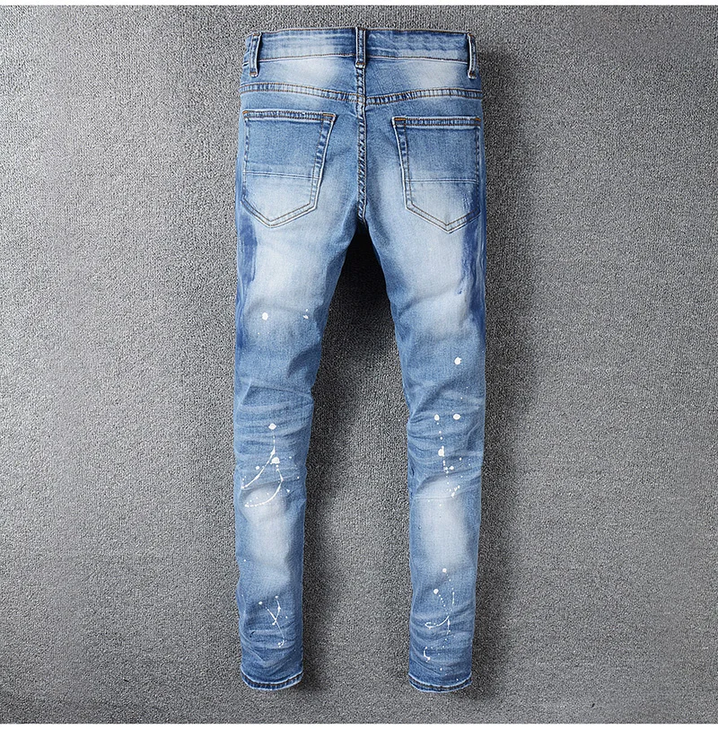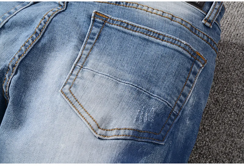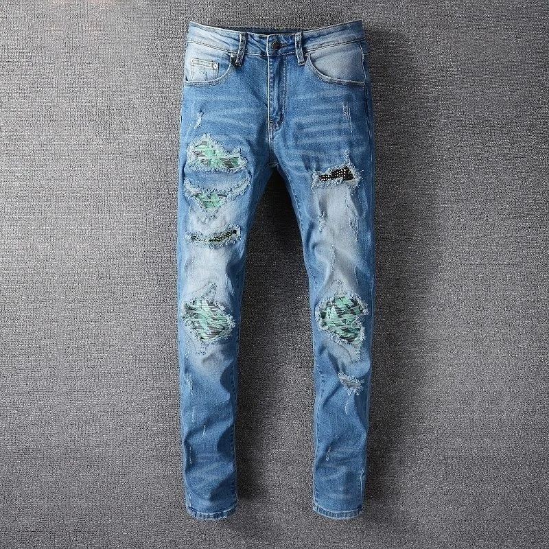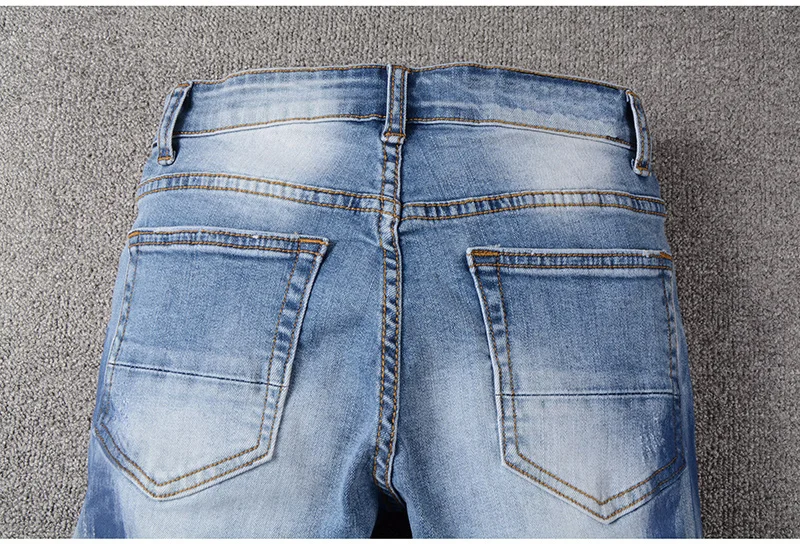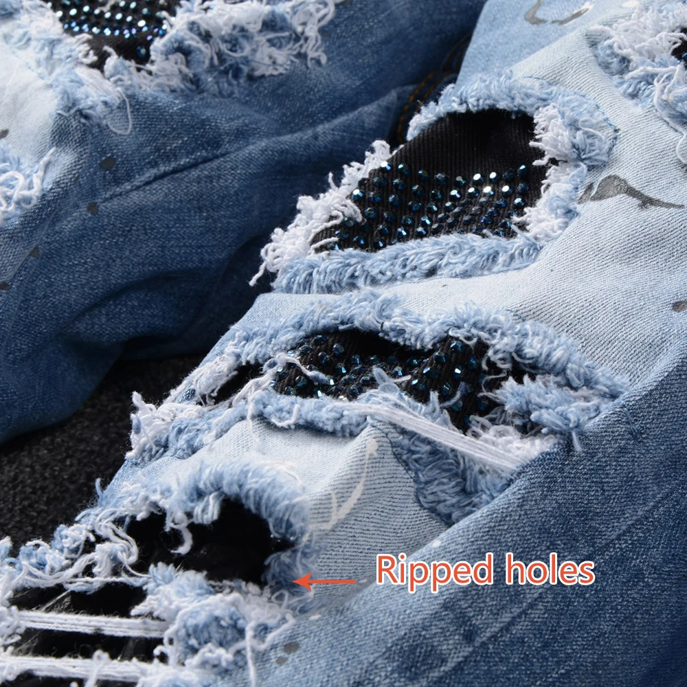 Мужские рваные джинсы со стразами, светильник-голубые узкие Стрейчевые брюки из денима в стиле хип-хоп