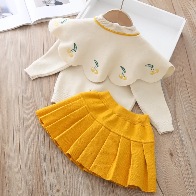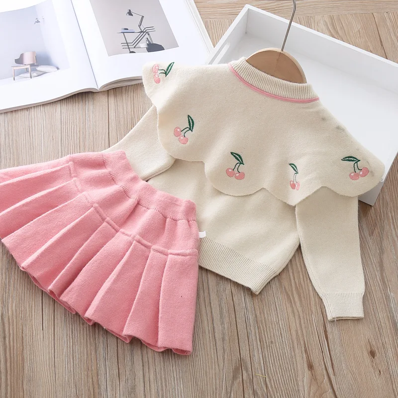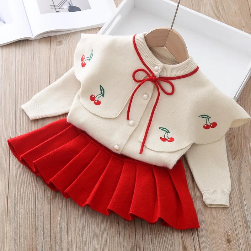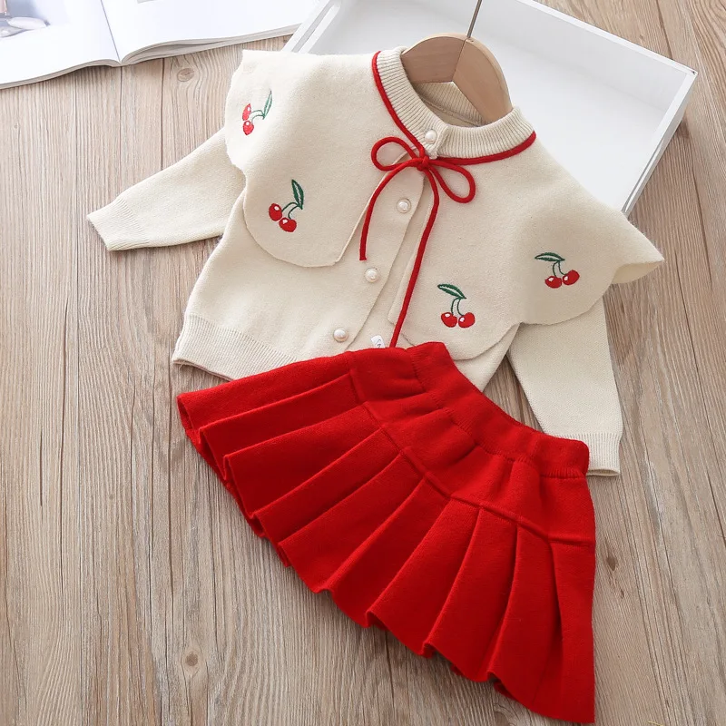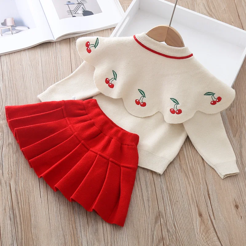 Осень 2022, вязаная одежда, комплект одежды принцессы для девочек, детская одежда для малышей, свитер с вишней + плиссированная юбка, костюм из двух предметов