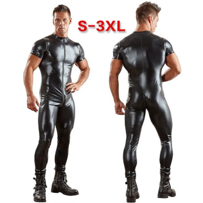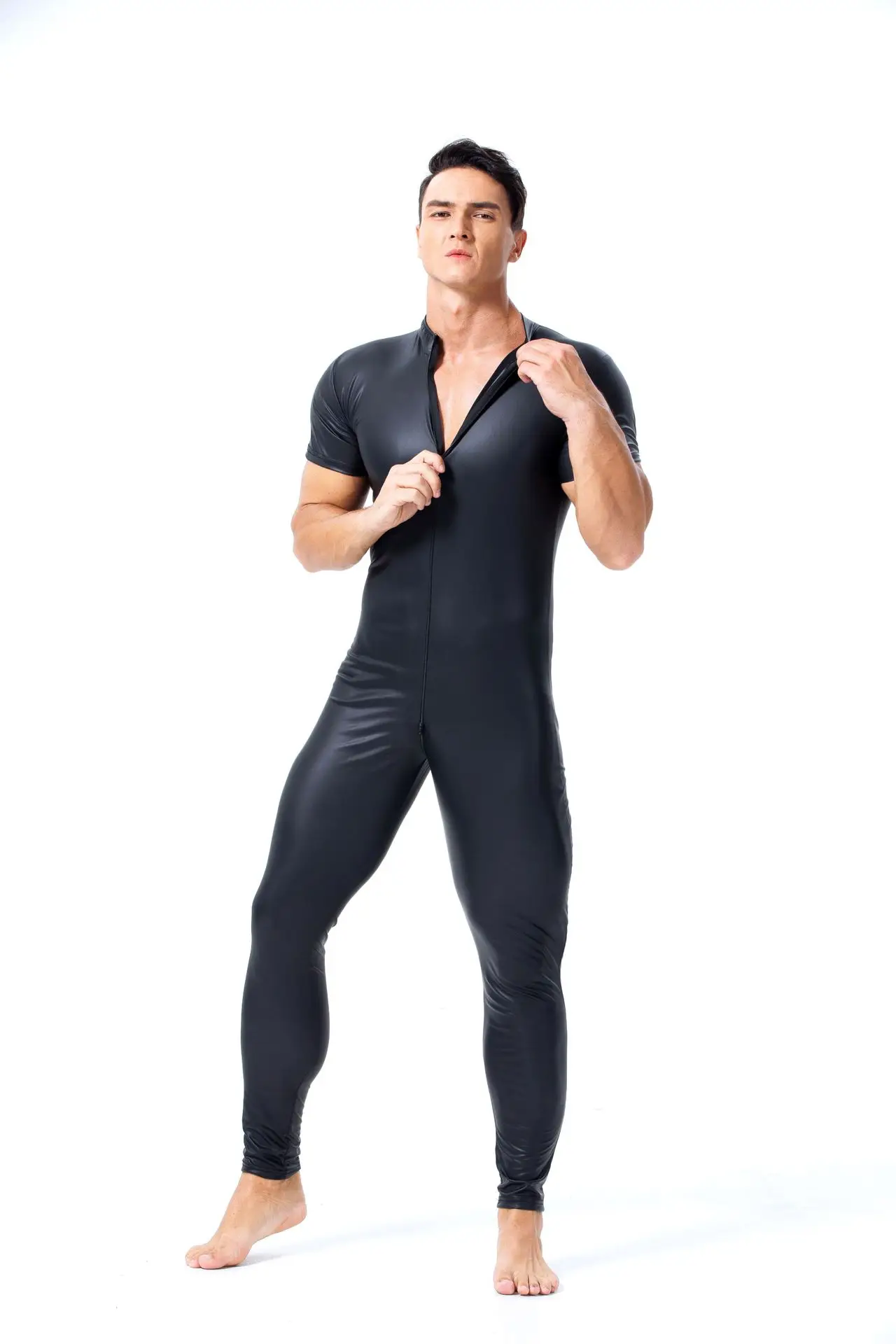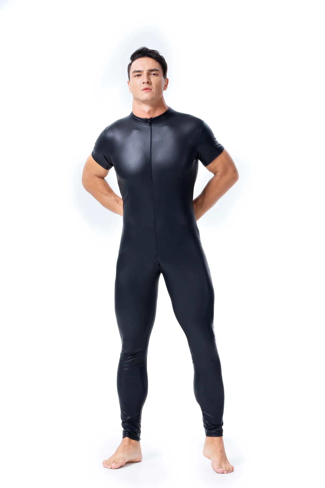 Комбинезон мужской из лакированной кожи, с коротким рукавом, двойной молнией, с открытой промежностью
