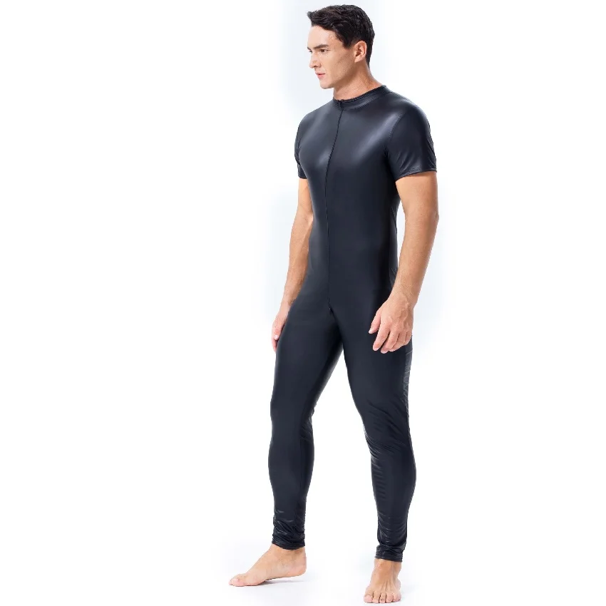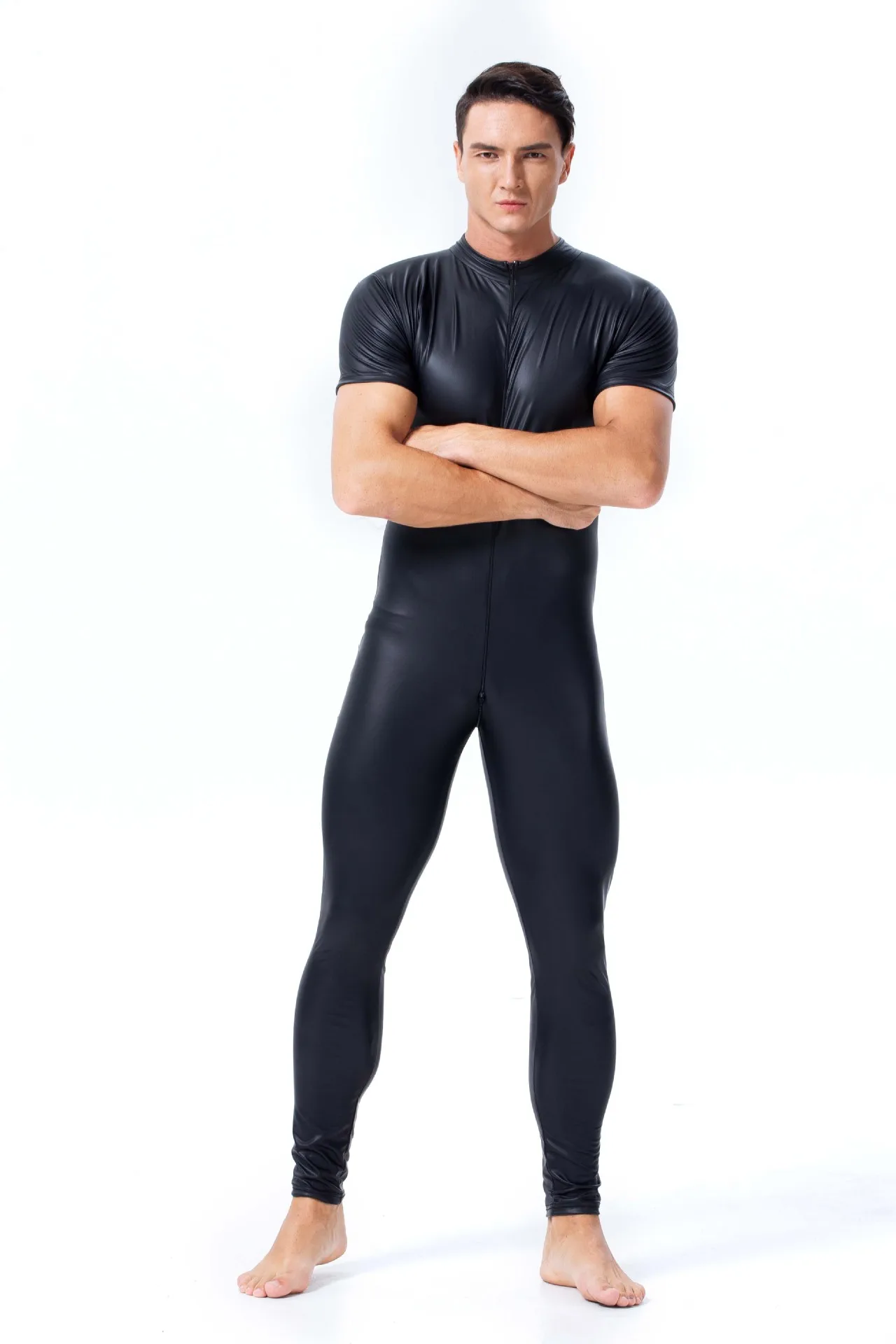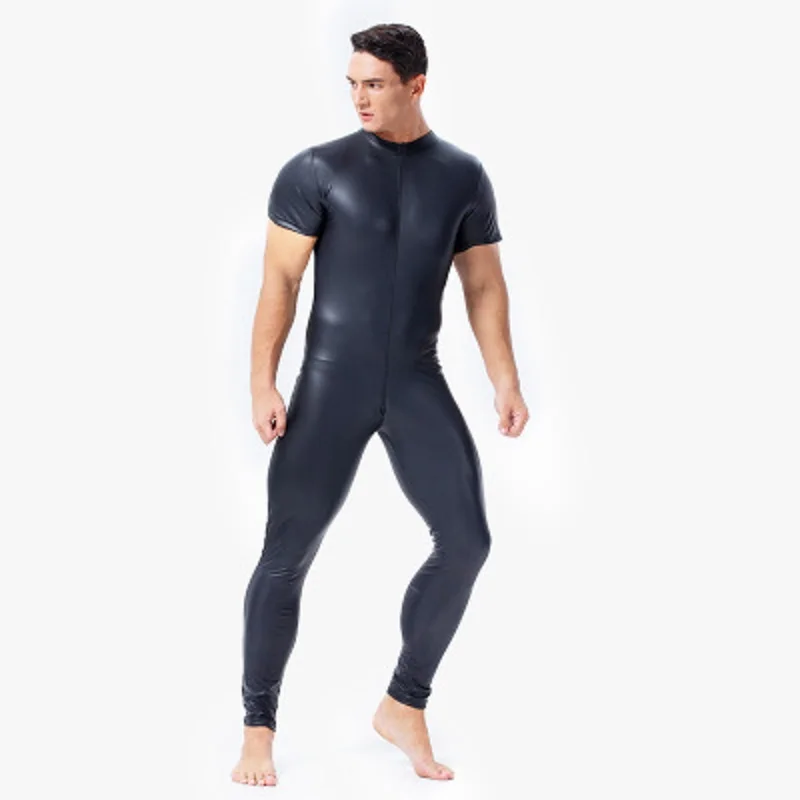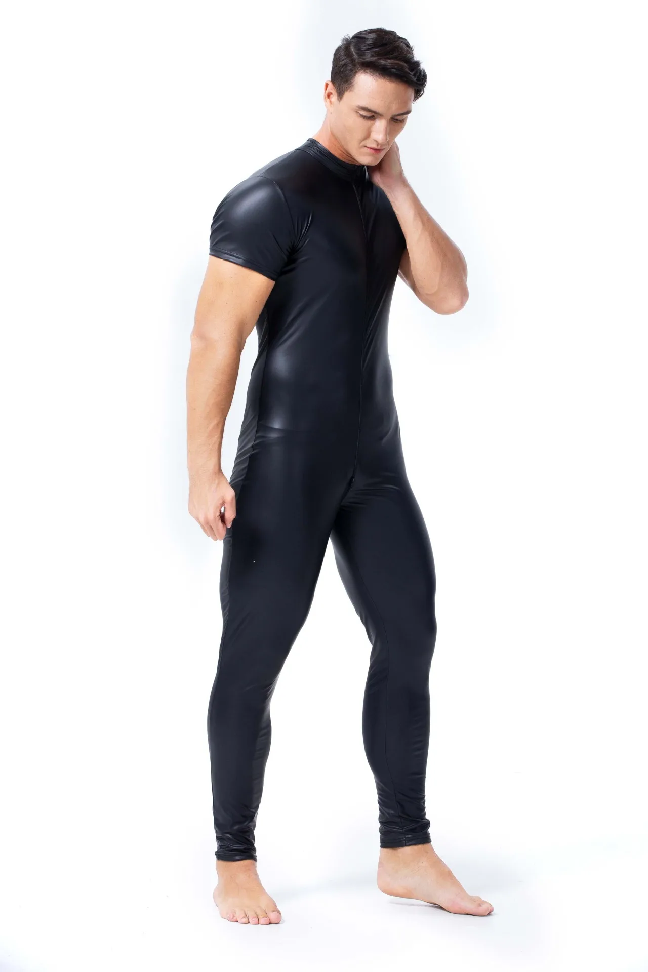 Комбинезон мужской из лакированной кожи, с коротким рукавом, двойной молнией, с открытой промежностью