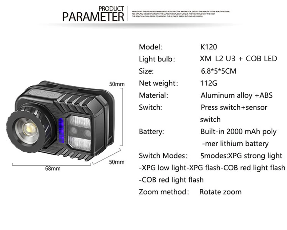 Описание:Мини и компактный, простой в использовании и удобный в переноске. Регулируемые ремни на голову, эргономичный дизайн.2 независимых кнопки для 4 режимов освещения (белый свет с низким-белым светом с высоким-красным светом-красная вспышка) для удовлетворения ваших различных требований.Регулируемое основание для каждой головной лампы, с наклоном назад и вперед.Подходит для кемпинга, альпинизма, пеших прогулок, ночной рыбалки, катания и других видов активного отдыха на свежем воздухе.Примечание:Водонепроницаемость: можно использовать в дождь, но не помещать его в воду.Спецификация:Материал: АБС-пластикМодель светодиода: 1 * XM-L2 U3 + 1 * красный светЦвет изделия: черныйЦвет излучения: белый и красныйРежим освещения: 2 режима (нажмите переключатель и переключатель датчика)Аккумулятор: встроенный аккумулятор емкостью 1800 мАчТип переключателя: 2 шт. независимый пресс-переключатель