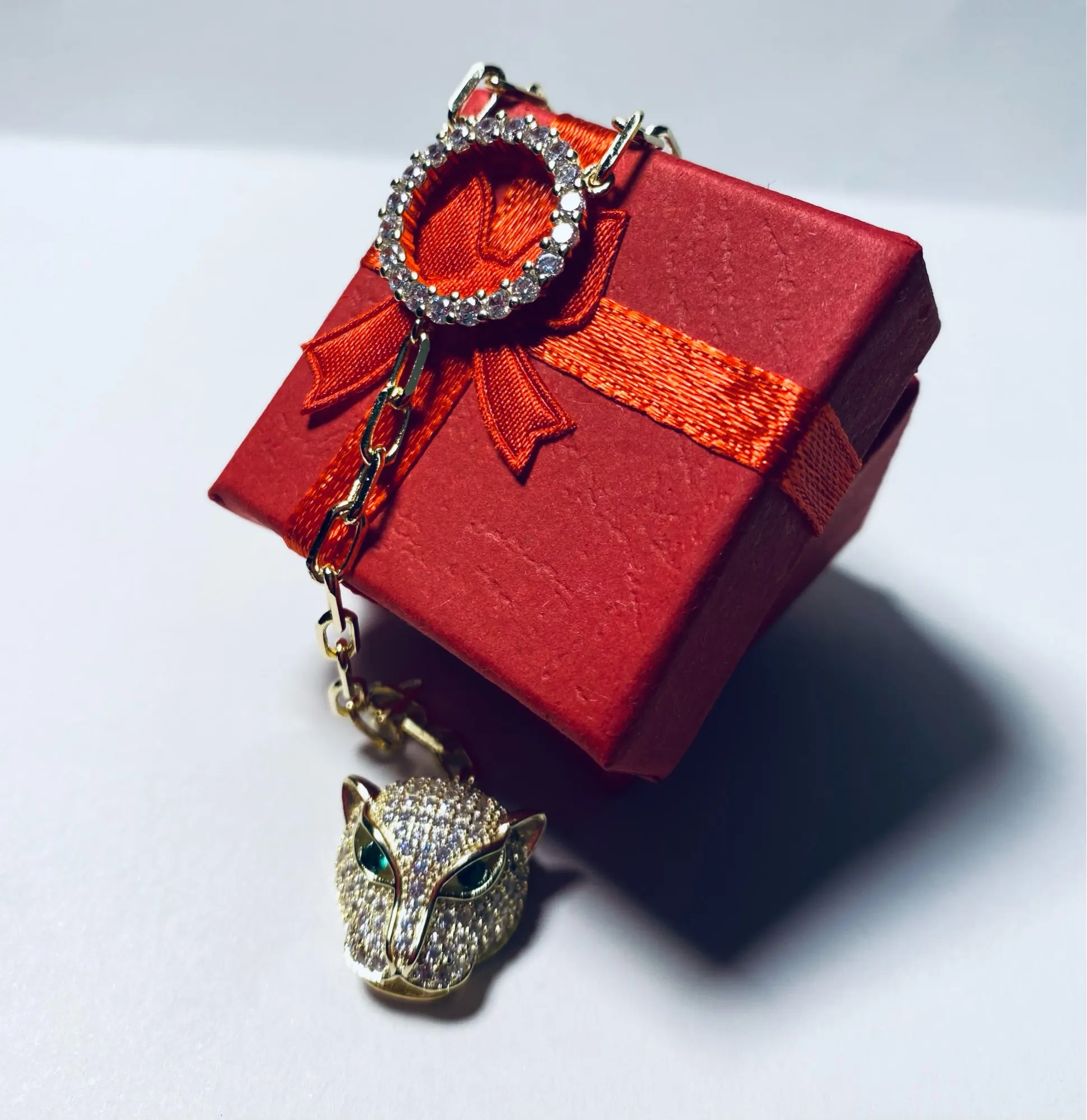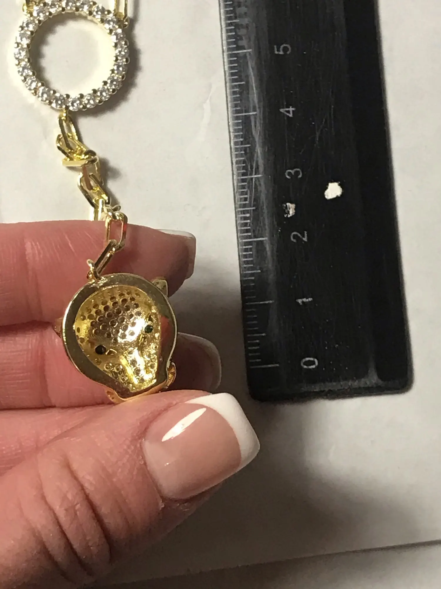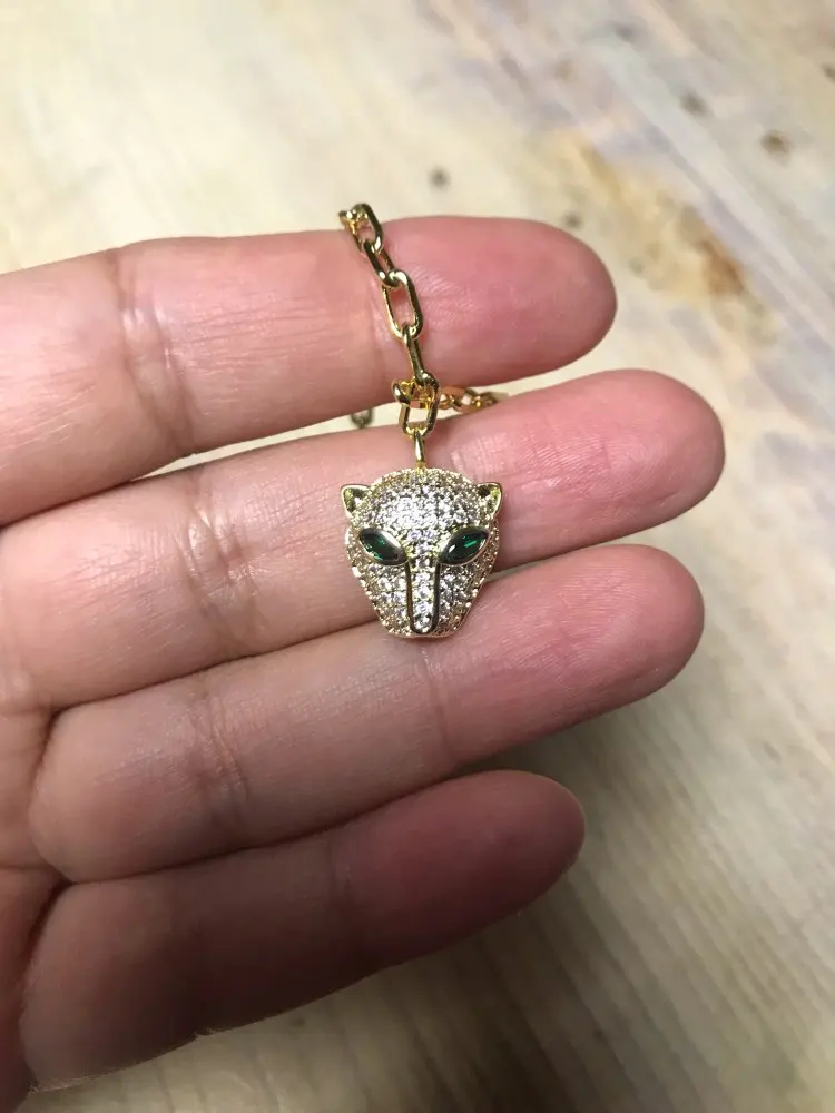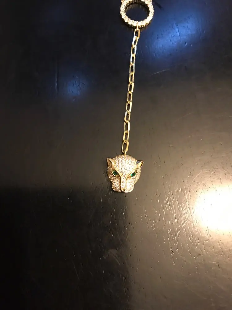 I tried to cancel this order.. I am so glad I was unable to!! This is beautiful!! The gold color looks like 14kt gold!! The color is not too orange or too brassy. The clear stones- all the stones sparkle. The Jaguar head is shaped beautiful! ( Some other Jaguar heads look like aliens.) Buy!! Highly recommend!! Also, shipping was fast!! Definitely a great purchase!!
