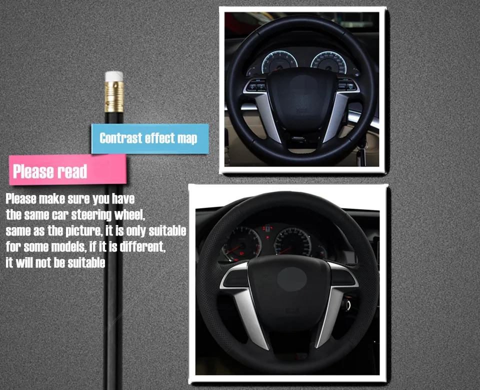 Пожалуйста, прочитайте перед покупкой (если вам нужны другие продукты, вы также можете проконсультироваться со службой поддержки клиентов) Перед покупкой, пожалуйста, проверьте рулевое колесо автомобиля и сравните с рулевым колесом на картинке. (Наша крышка рулевого колеса является индивидуальным продуктом, если есть какие-либо различия, она не будет применяться)! A Этот товар-чехол для руля, а не руль! A Этот продукт подходит для Honda Crosstour 2012 Pilot 2009-2015 Odyssey 2011-2017 Accord 8 2008-2012 других моделей. Если у вас есть какие-либо вопросы, пожалуйста, сначала свяжитесь со службой поддержки клиентов