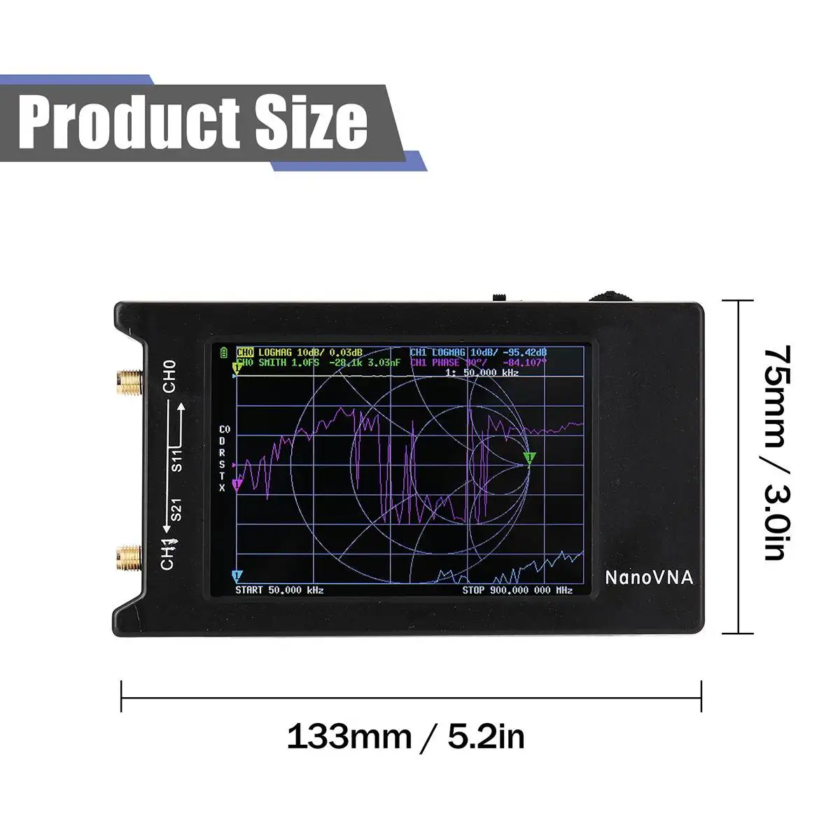 Характеристики: Модель: F57584 Корпус ABS: 75 мм x 133 мм x 18 мм (без выступов) Частота измерения: 50 кГц ~ 1,5 ГГц Выход RF: 0dbm (± 2 дБ, основная волна) Точность частоты: <2ppm Стабильность частоты: <0,5 ppm Диапазон измерения: 70 дБ (50 кГц-300 МГц), (60 дБ (300 м-900 МГц), 40 дБ (0,9 г-1,5 ГГц) позволяют расширить прошивку) (Примечание: обратите внимание на ошибку, вызванную нелинейным преобразованием фундаментальной волны при использовании гармонических измерений.) Порт SWR: <1,1 Дисплей: 4 "TFT (320x480) Интерфейс USB: USB type-C; Режим связи: CDC (серийный) Источник питания: USB 5В 200мА. Максимальный зарядный ток 1A Количество калибровочных точек: 101 (фиксированное) Количество точек сканирования: 101 (фиксированное) Отслеживание дисплея: 4, маркировка: 4, Сохранение настроек: 5 Измерение s-параметров, коэффициента стоящей волны напряжения, фазы, задержки, диаграммы Смита, анализа времени домена и т. Д.