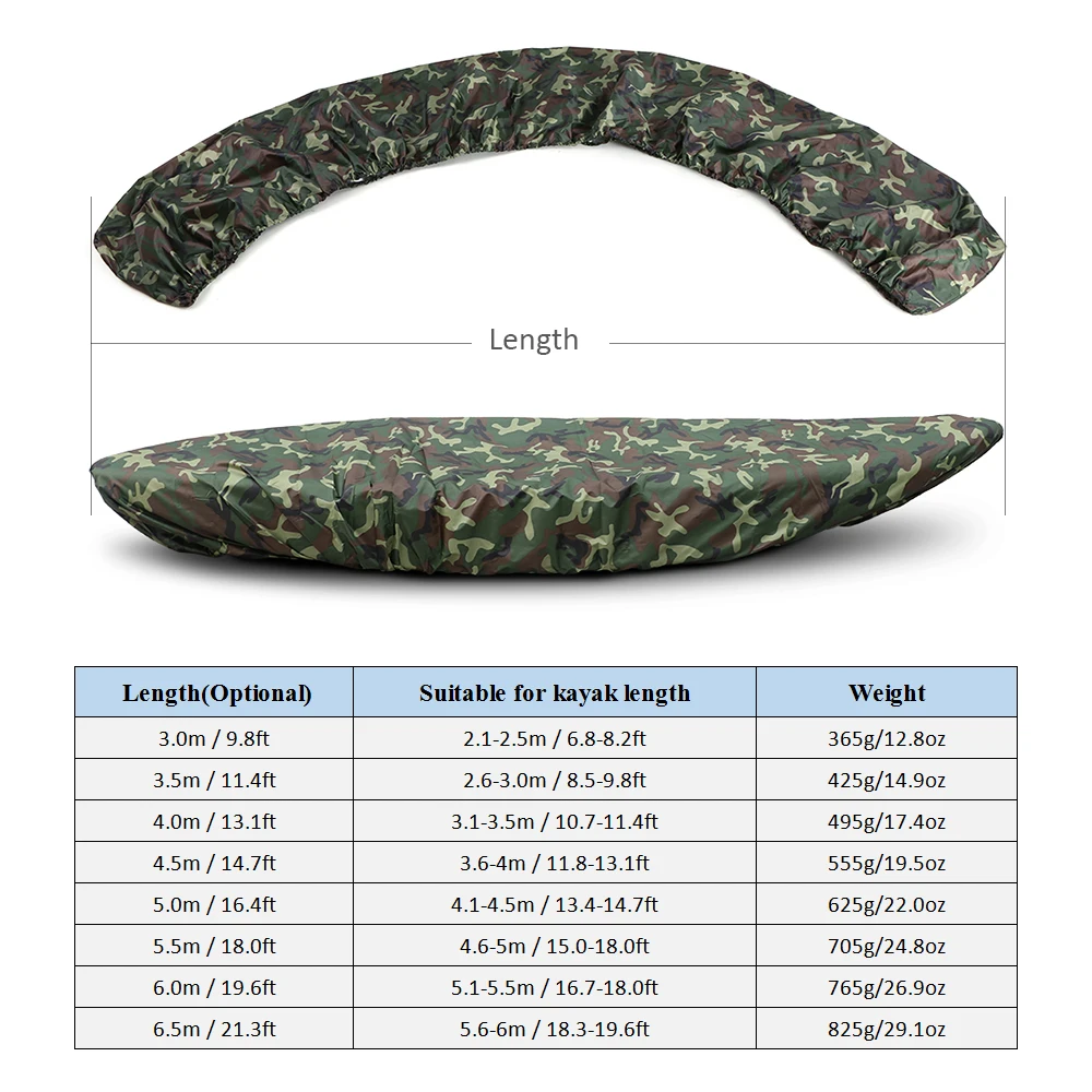 Чехол для Каяка предназначен для тех, кто хочет сохранить каяк в чистоте.Особенности:Защита от УФ-лучей, водонепроницаемость и защита от пыли.Застежка в рулоне и зажиме регулируется для байдарок.Простота в эксплуатации без необходимости каких-либо других инструментов.Обеспечивает большую защиту для вашего Каяка на пляже или на заднем дворе.Характеристики:Материал: ткань ОксфордЦвет: камуфляж 1/Камуфляж 2/Камуфляж 3 (опционально)Подробности: