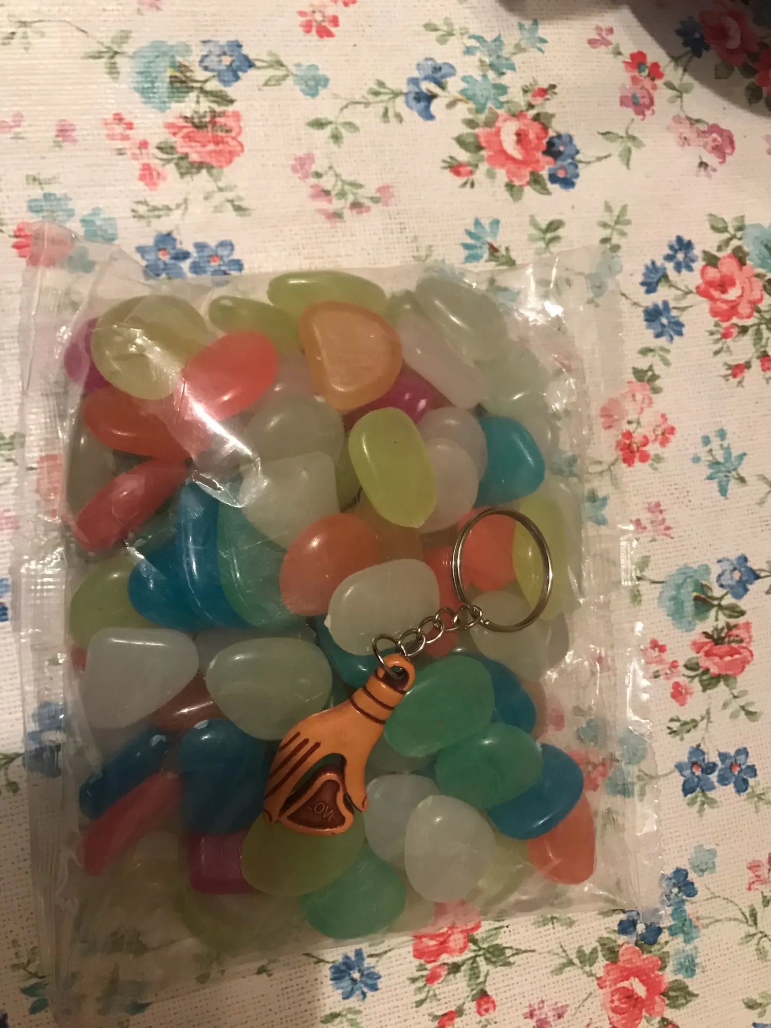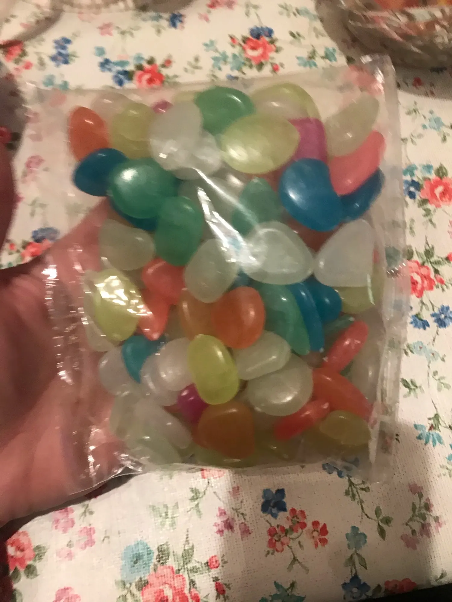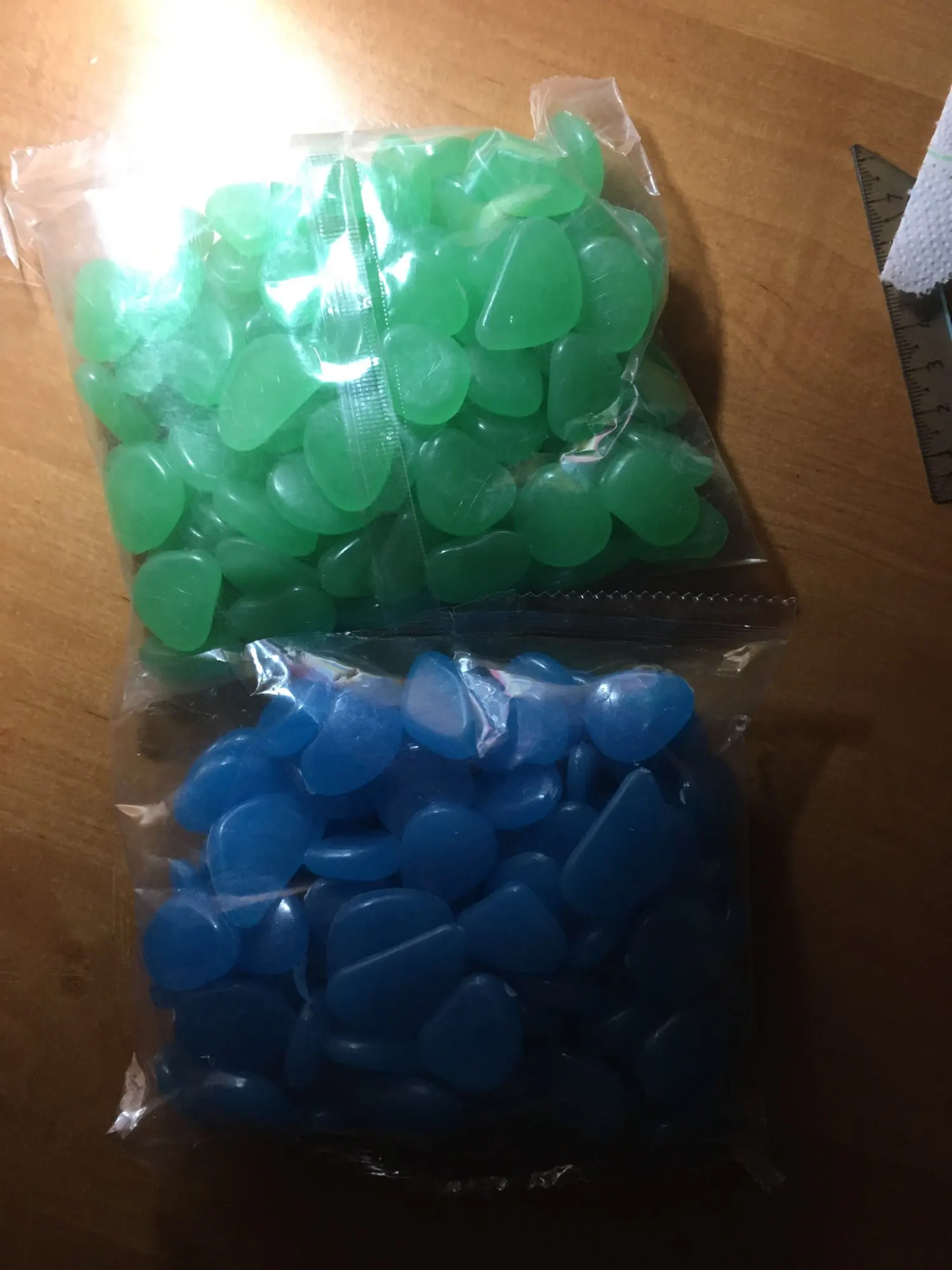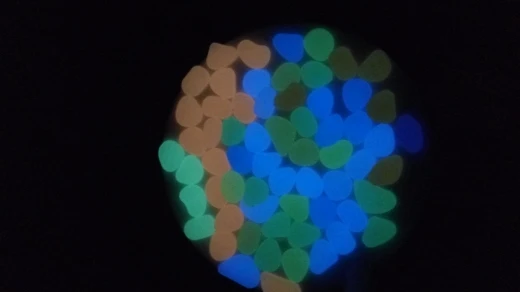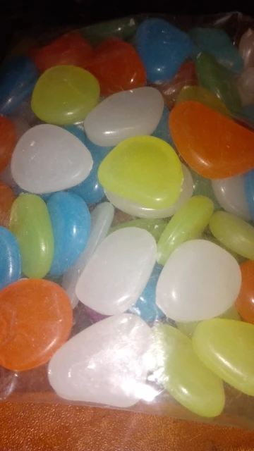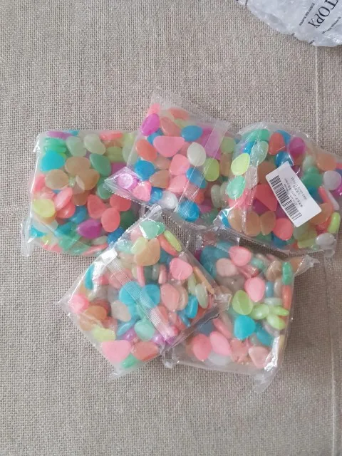 доставка быстрая. камушки цветные, красивые. но в темноте не светятся. попробую оставить на день на свету, вечером проверю будут ли они светяться.