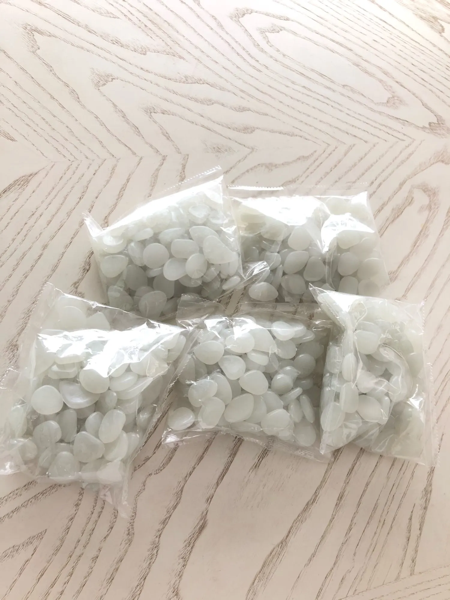 Получил быстро и согласно описанию. Прибыло в 5 мешках по 100 штук в каждой. Оберните в полиэтиленовый пакет и пузырчатую пленку. Около 30 минут под кухонными огнями (LED) они светятся. Они довольно маленькие, поэтому 500 не так сильно, как вы думаете. Я, вероятно, куплю больше, чтобы выровнять дно моего проекта садового фонтана.