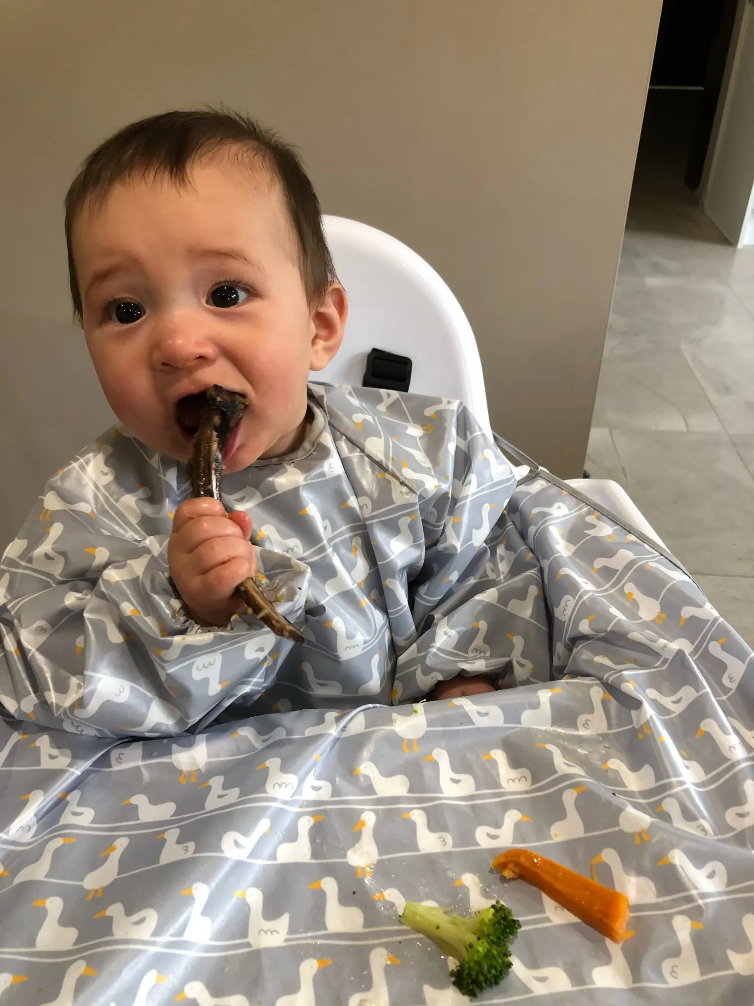 Это большой нагрудник, который крепится как на ребенка, так и на высокий стул. Как в описании. Но размер очень большой, ребенок имеет рукава везде, и это мешает ему хорошо питаться. Они должны сделать размеры меньше для детей 6/9 месяцев, которые начинают питаться дополнительными продуктами, а также с самой падающей пищей.