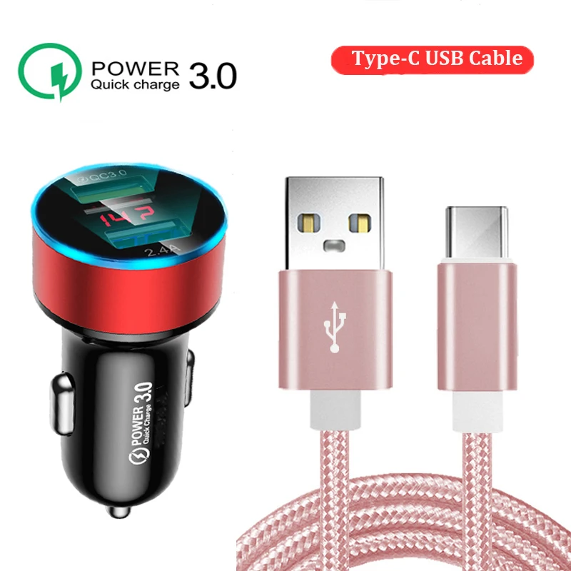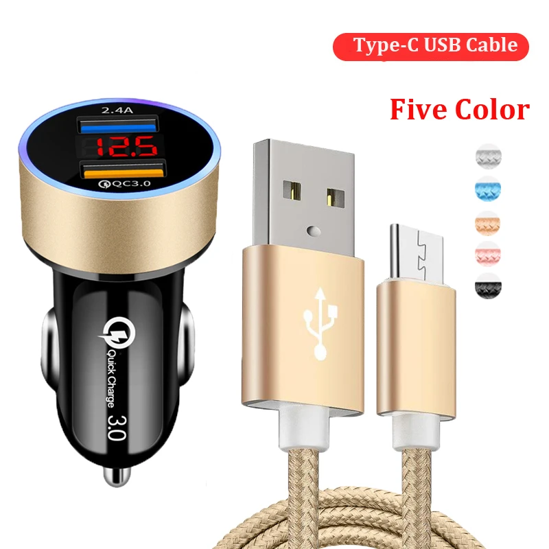 QC3.0 двойное автомобильное зарядное устройство USB Тип C USB плетеный кабель Быстрая зарядка шнур для Xiaomi MI 11 9 10 T Lite Redmi 8 9 Note 8 9 8T Pro