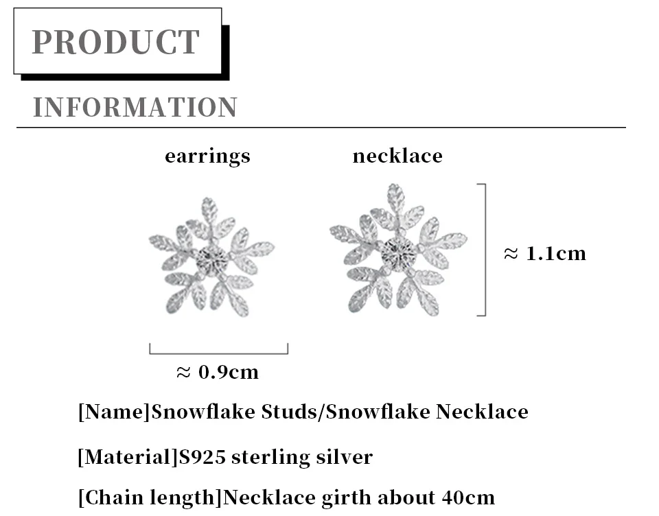 【Descriptions】 Название продукта: женские серьги с подвеской в виде снежинок/ожерелье с подвеской в виде ключицы Цвет: серебристый Цвет Материал: Стерлинговое Серебро 925 пробы Длина ожерелья: около 40 см Кулон узор: снежинка Цепочки и ожерелья Размер подвески: около 1,1 см * 1,1 см Серьги Размер подвески: около 0,9 см * 0,9 см Пол: женщин, девушек/женщин/девушек Повод: День рождения/вечерние/деловые/юбилейные/ Подарок/сувенир Тип: женское ожерелье с подвеской/серьги Посылка включает в себя: 1 шт.