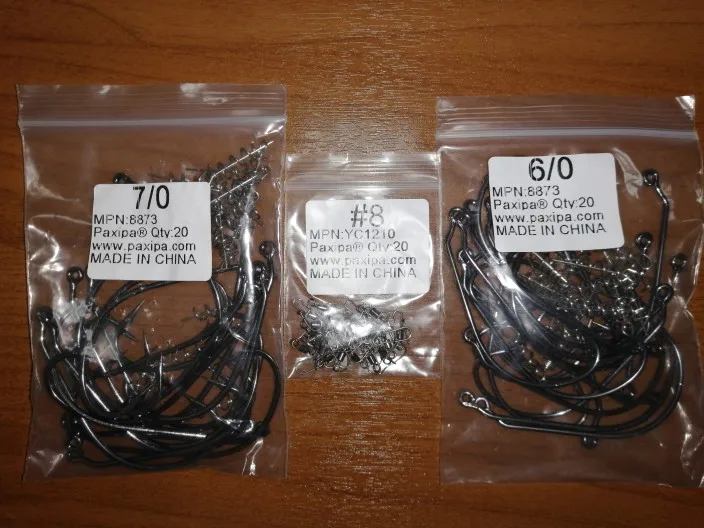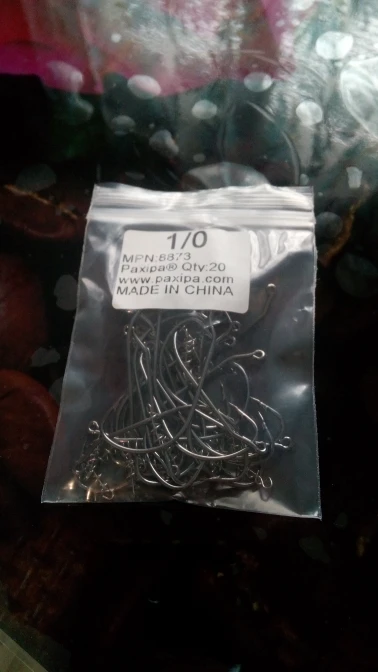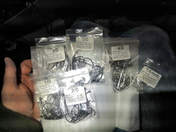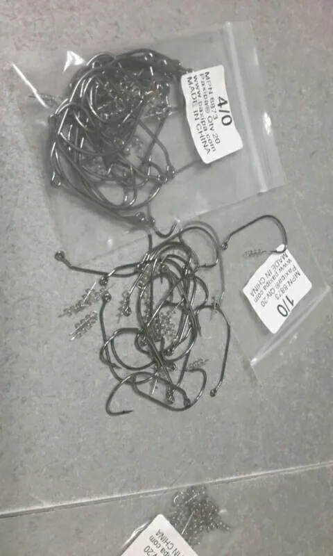 Ordered sizes of hooks from 1/0 to 7/0. All arrived in correct quantity and packed nicely. Good strong hooks and equivalent if not better than well known brands, maybe not as sharp but good enough for me. The hooks looks to be nickle coated and not sure of durability for use in salt water but for the price. if it rusts I will just change it. overall very satisfied. will buy again