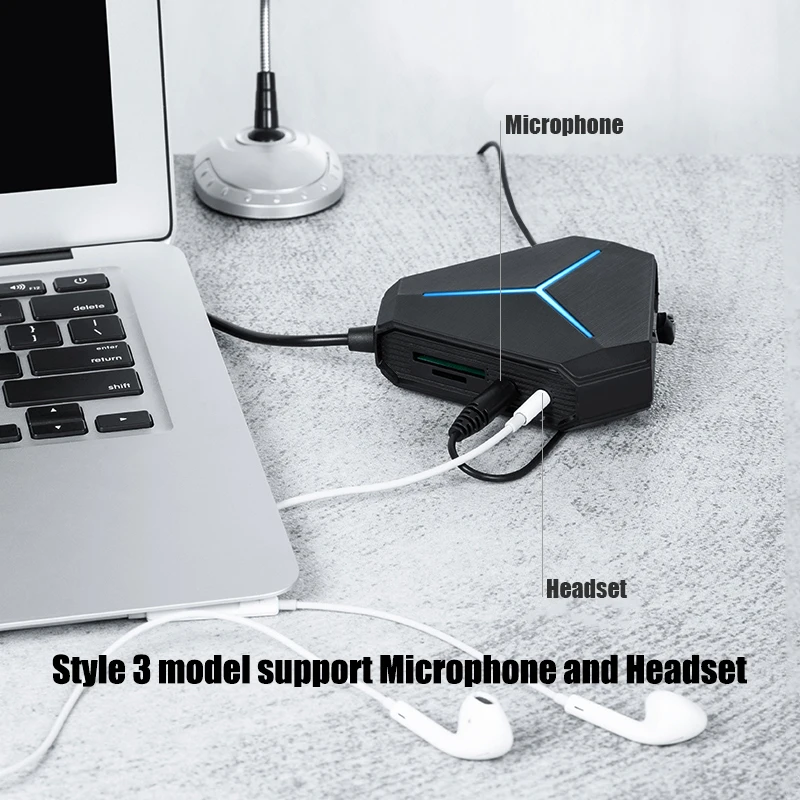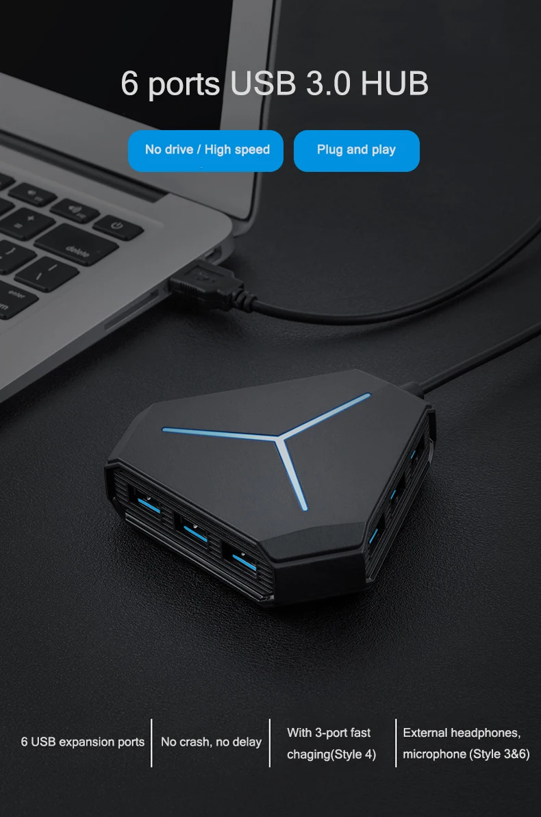 USB порты: 6Кабель: около 100 смСкорость передачи данных: до 5 Гбит/сСовместимость: системы Windows,Mac OS или LinuxПитание: Micro USB 5V 1A / 5V 2AПримечание 1: не поддерживает зарядку устройств iOSПримечание 2: только модель Style6 с функцией AUX и MIC одновременно, пожалуйста, обратите внимание при покупке.