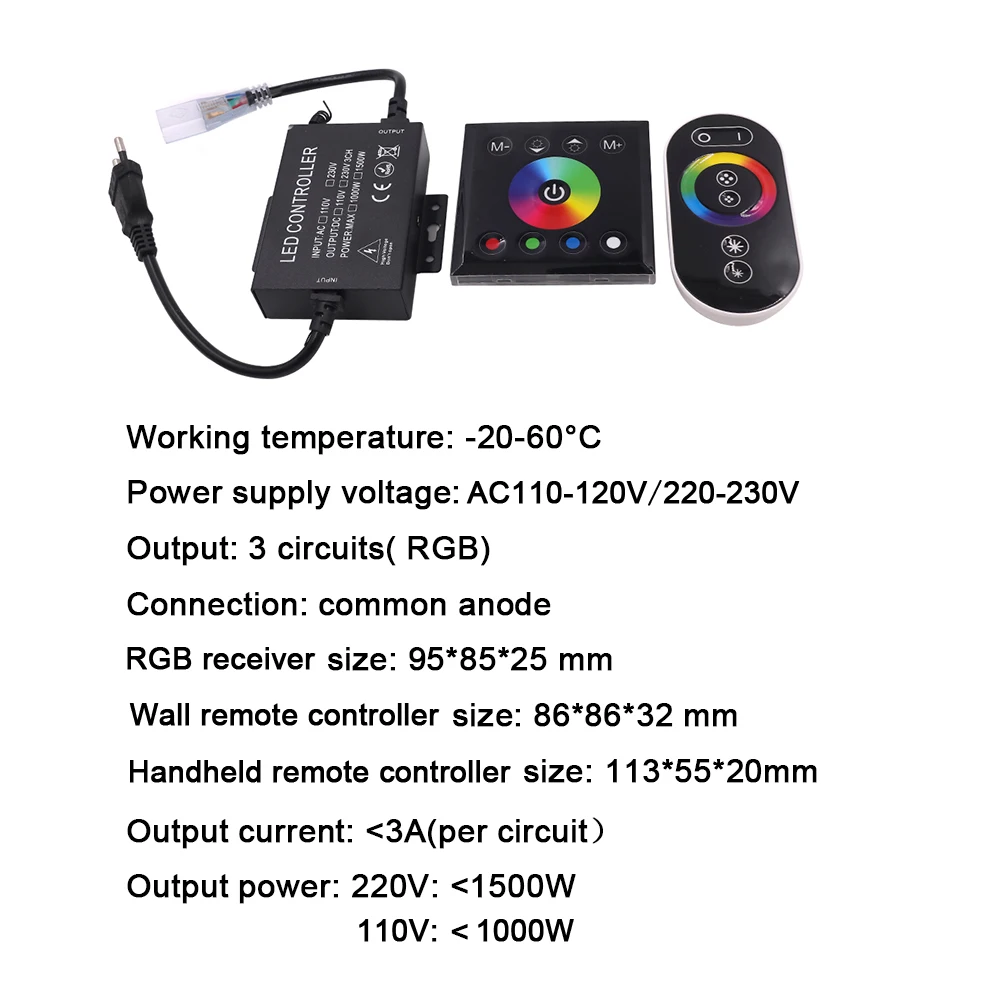 2)RGBСветодиодная неоновая лента поставляется с1 шт. ручнойRF полный сенсорныйПульт дистанционного управления (3 * AAAБатарейкаНе входит в комплект) и 1 настенный радиочастотный сенсорный пульт дистанционного управления и 1 шт. 1500 ВтКонтроллер с европейской вилкой и некоторыми алюминиевыми зажимами (1 м светодиодная неоновая лента с 1 шт. зажимом),
