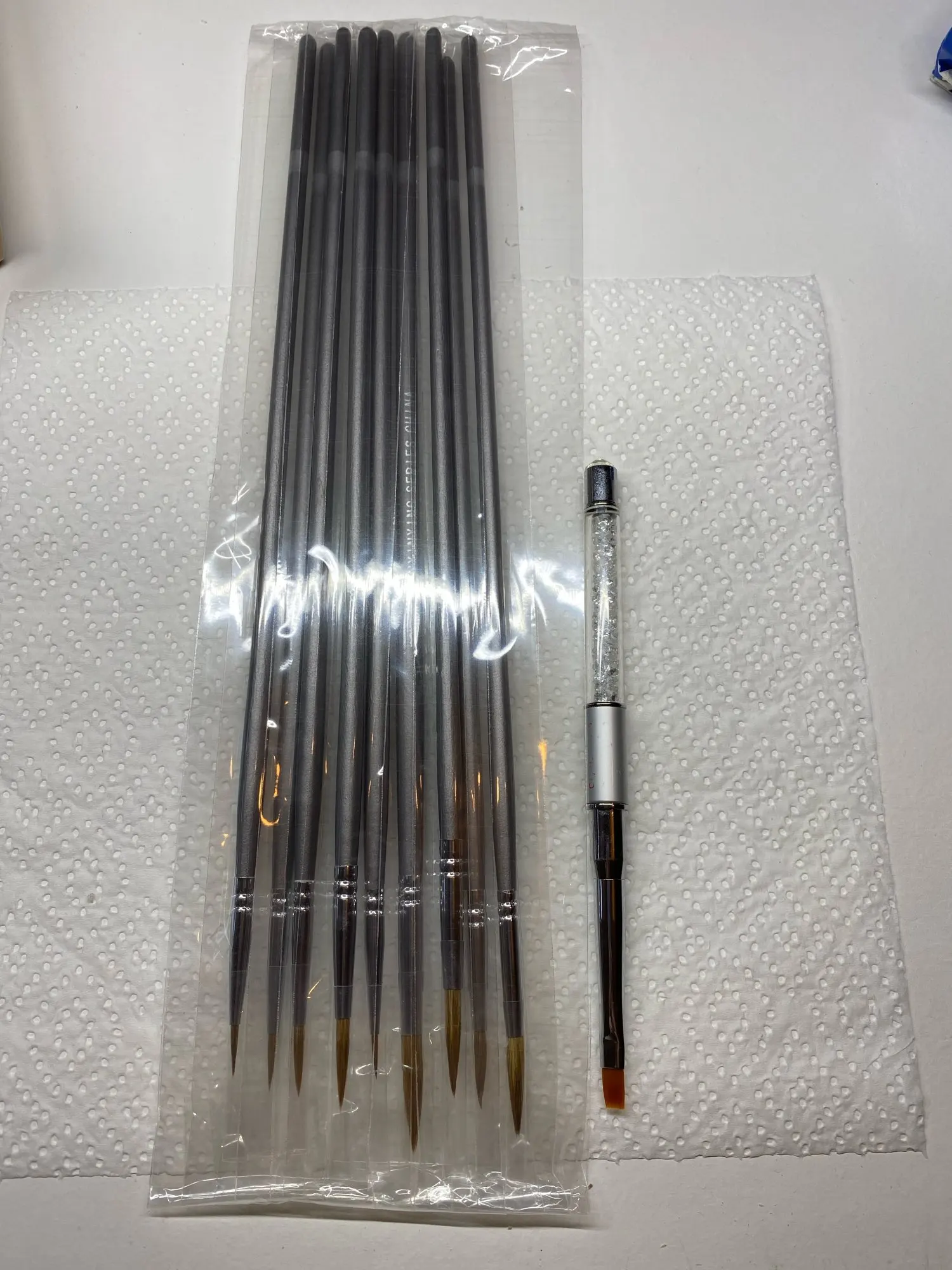 Всем привет! Кисти отличные, тонкие, длинная ручка (30 см), упаковка набора нормальная, все дошло в целости и сохранности, плюс каждая кисть упакована в отдельный пакетик, наконечники аккуратные и тонкие. Заказ отслеживался. Доставка в Москву очень быстрая, заказ сделала 2 мая, на почте забрала 13 мая. С продавцом не общалась, не было необходимости. Покупала кисти за 766,75 рублей. Позже дополню отзыв, когда попробую их в работе. Пока все супер и все нравится!