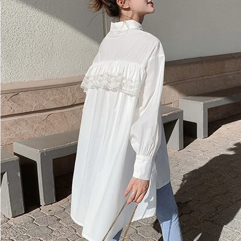 Женская белая, черная рубашка с длинным рукавом, Корейская, шикарная, кружевная, с рюшами, в стиле пэчворк, Kawaii, Длинная блузка, большие размеры, Harajuku, женские осенние Топы