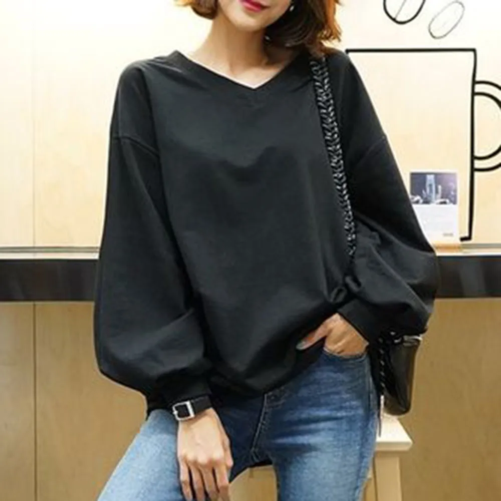 Женский однотонный худи, Осенний Однотонный пуловер с длинным рукавом и v-образным вырезом, японский элегантный офисный Повседневный женский топ, минималистичный черный цвет