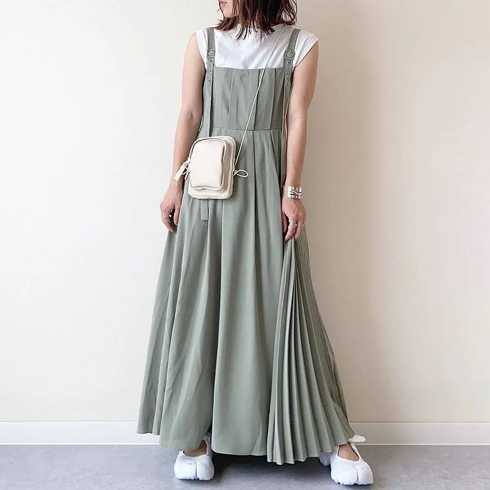 Японское женское длинное платье с поясом, плиссированное платье макси на подтяжках, однотонное женское платье на бретельках, плиссированное лоскутное платье