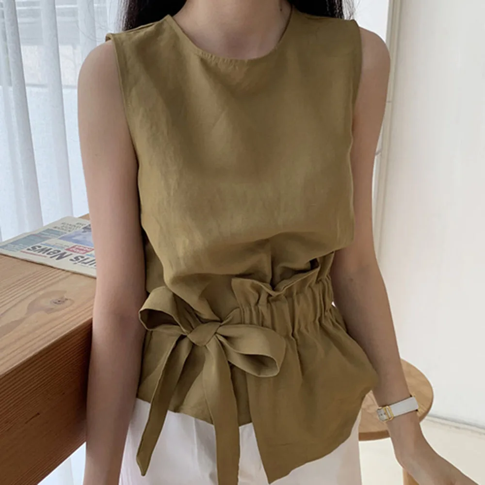 Женский летний топ без рукавов в Корейском стиле с круглым вырезом, плиссированная туника с завязками спереди, Асимметричный топ без рукавов, милая одежда