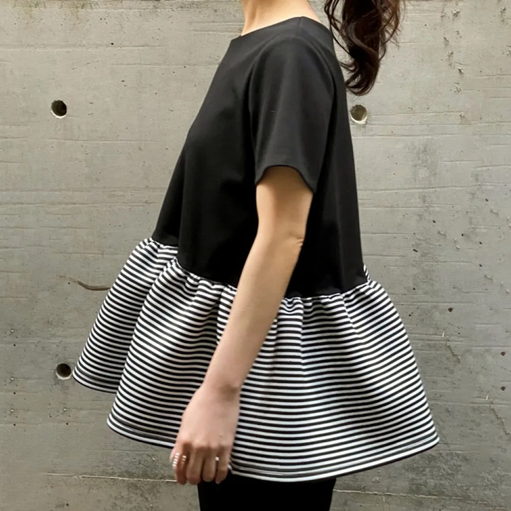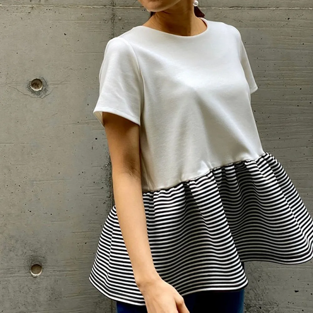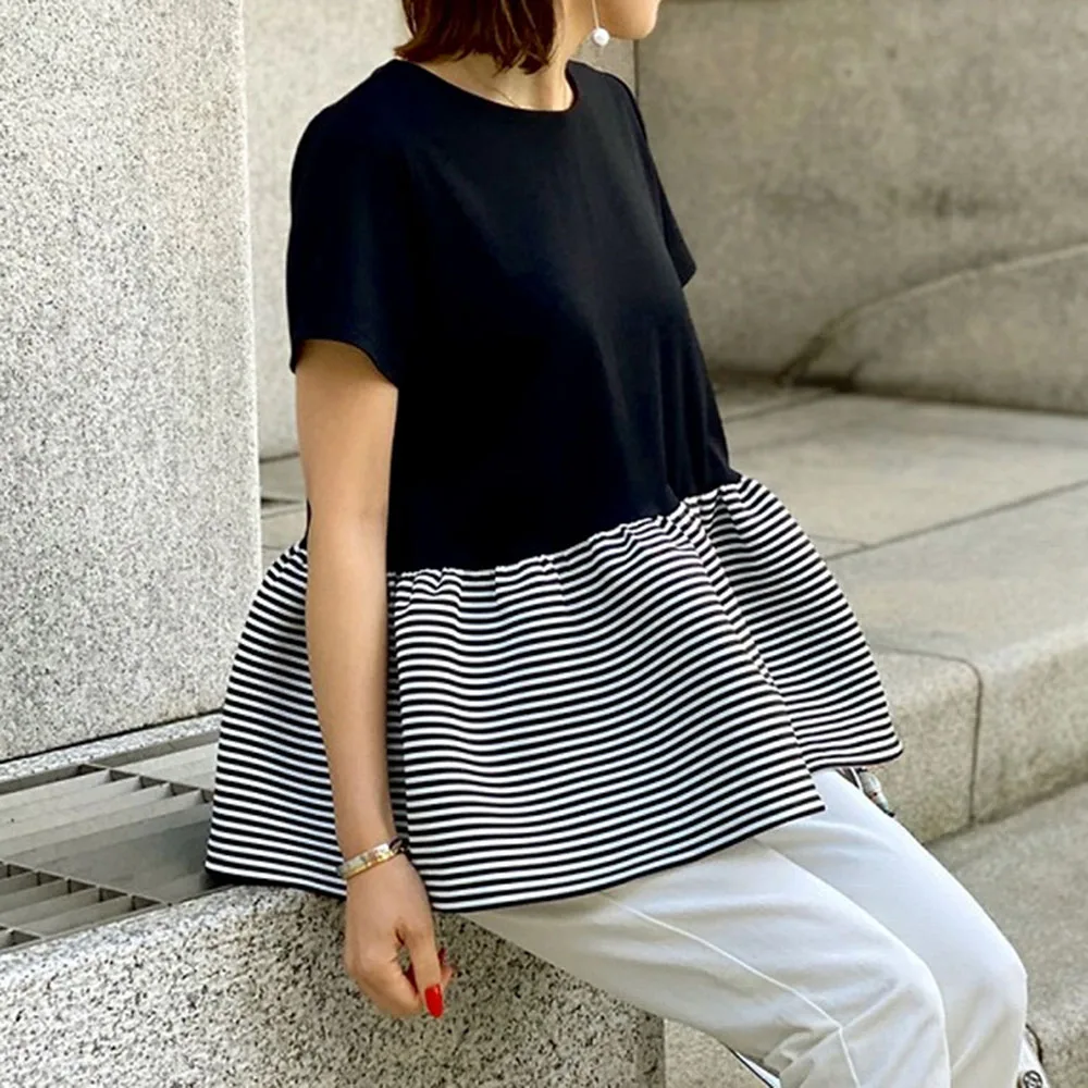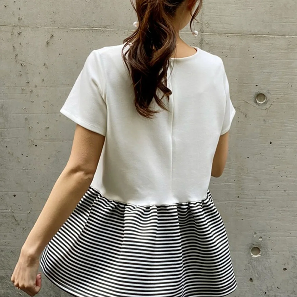 Женская Милая футболка в полоску, с оборками, с высокой талией, в стиле пэчворк, с баской, большой белый, черный топ, женская футболка Kawaii, летняя футболка в Корейском стиле
