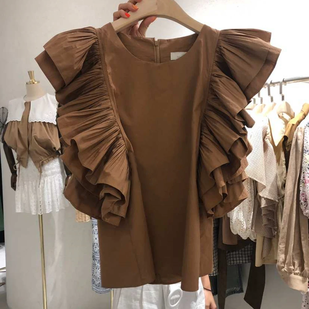 Повседневные женские рубашки с оборками, топы 2020, летние корейские женские блузки с коротким рукавом, офисные женские блузки, рубашки