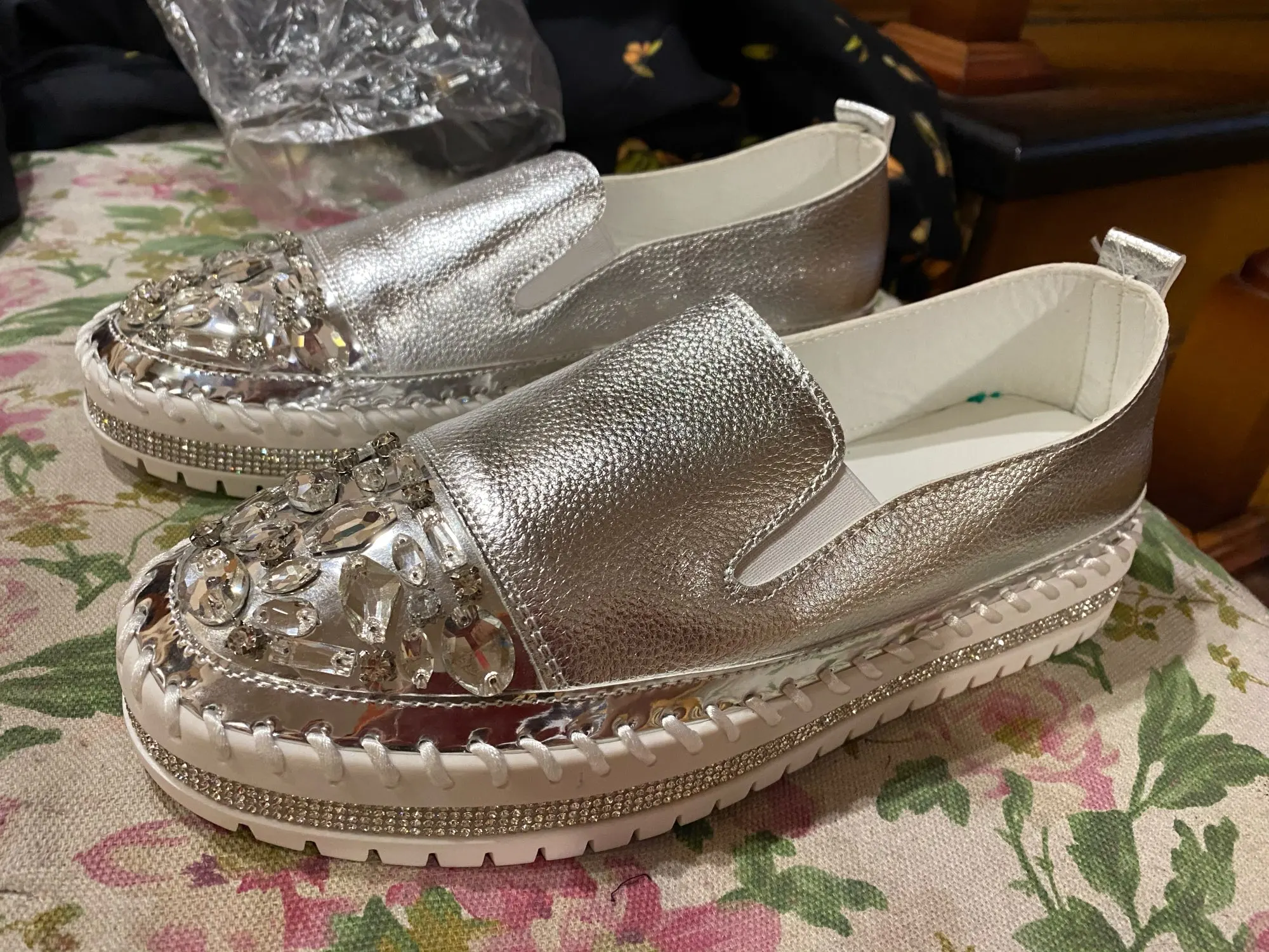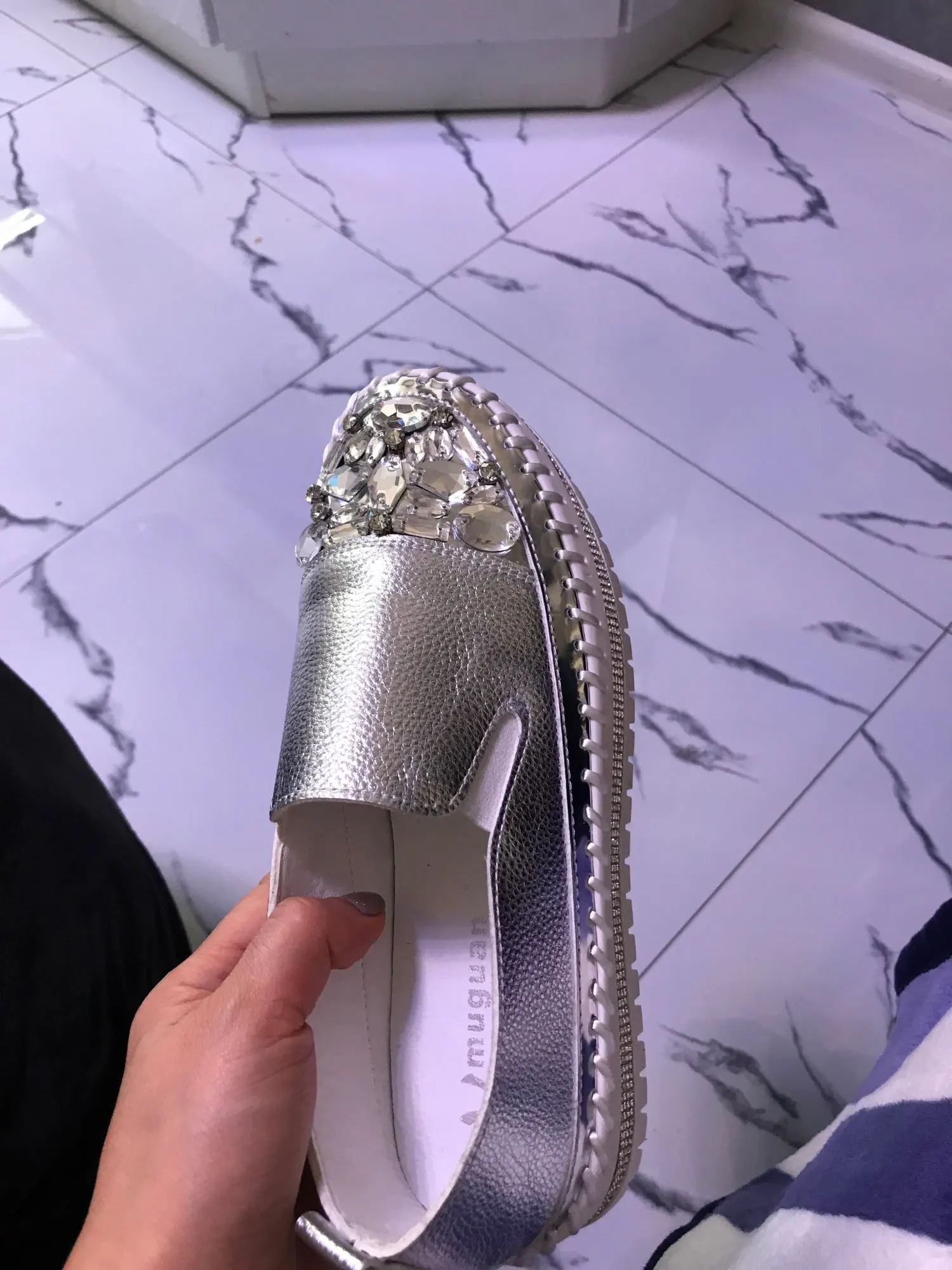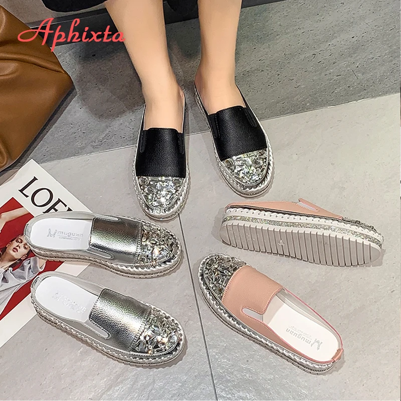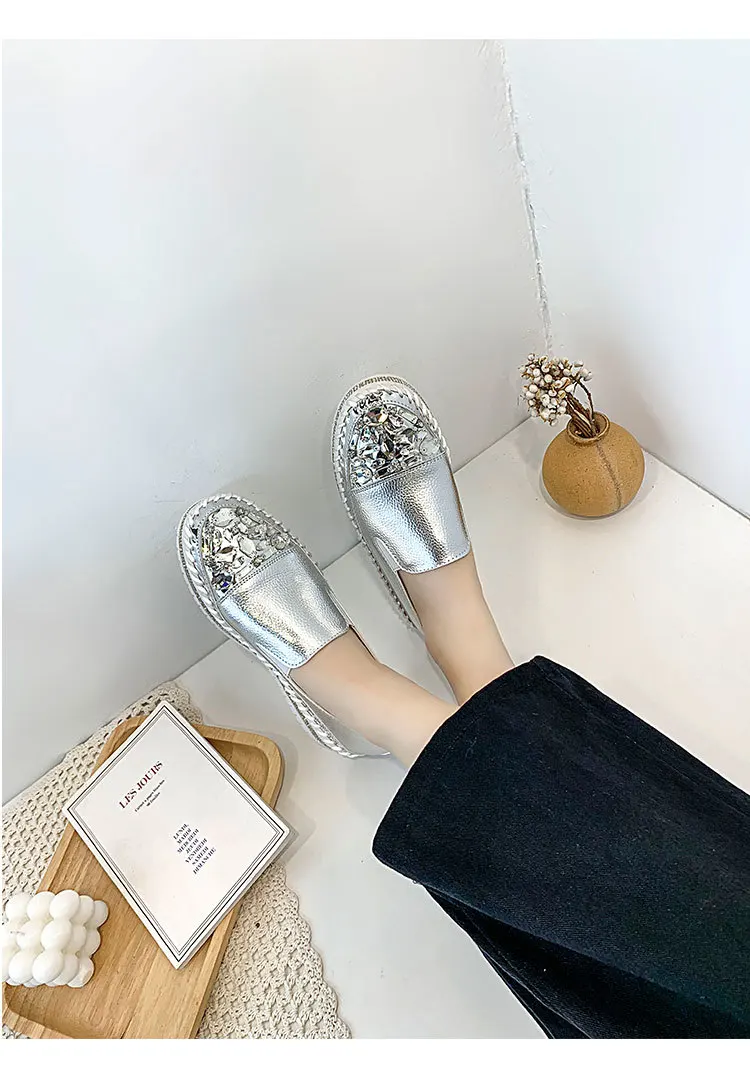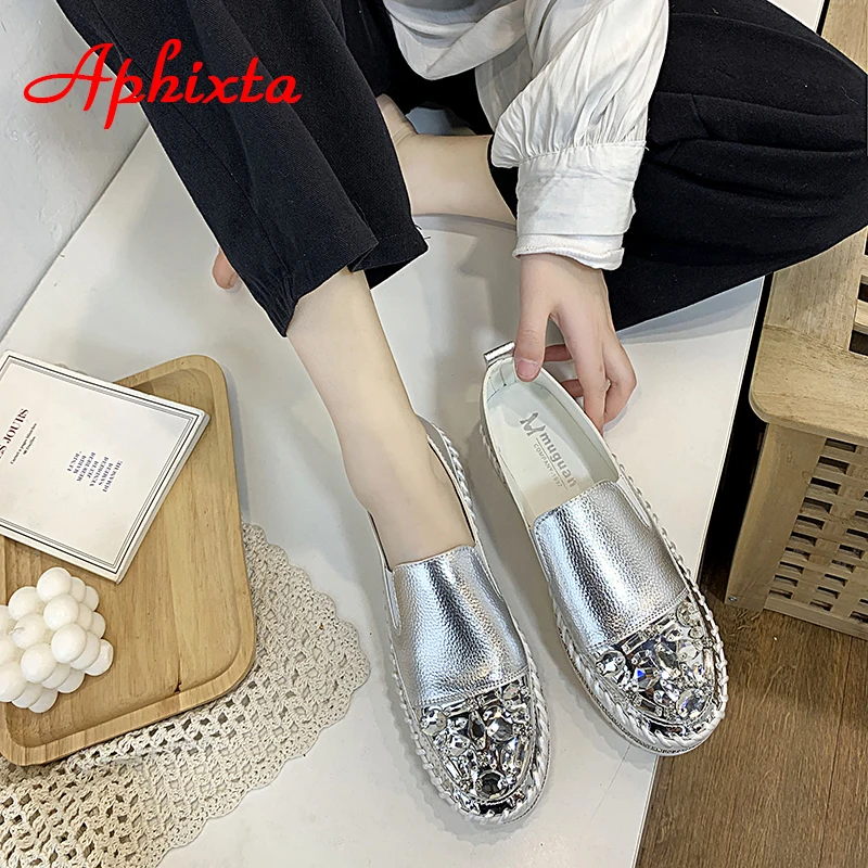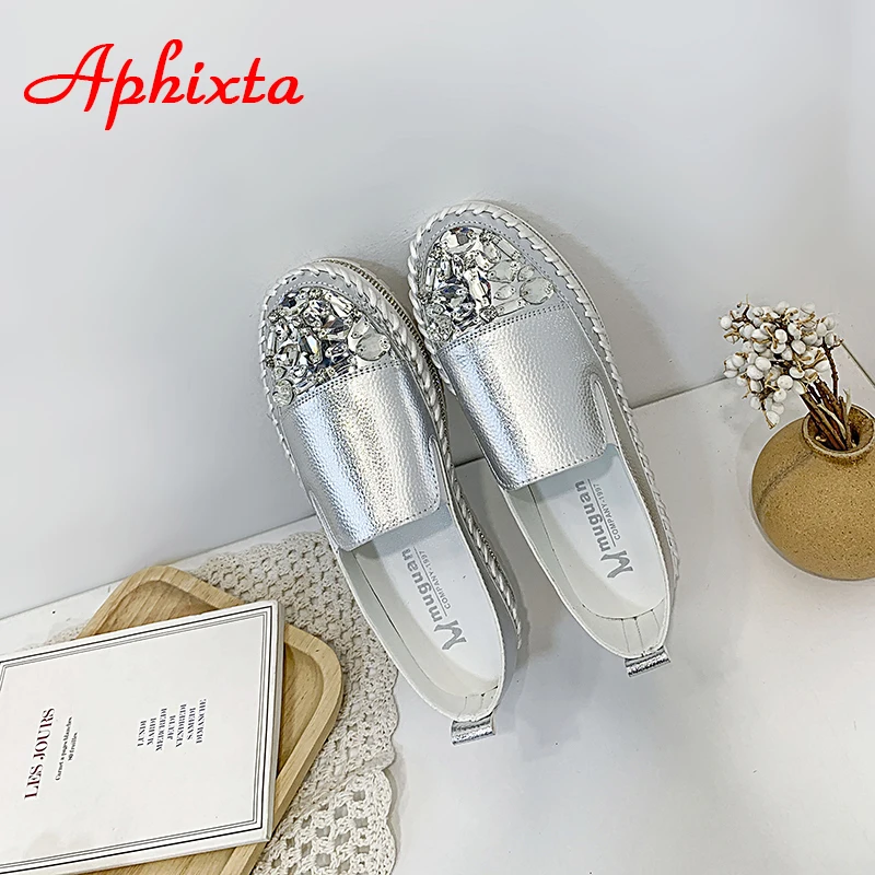 Женские кожаные туфли на плоской подошве Aphixta, серебристые лоферы с кристаллами, с круглым носком, на платформе, размер 43