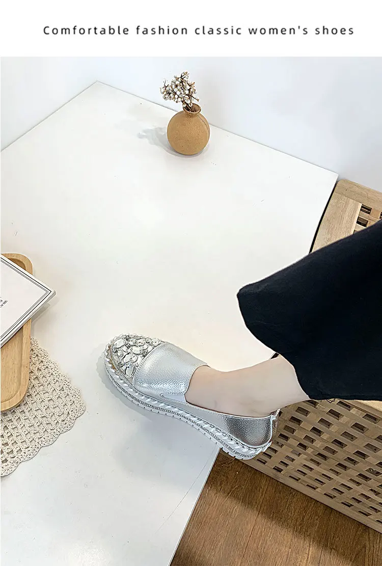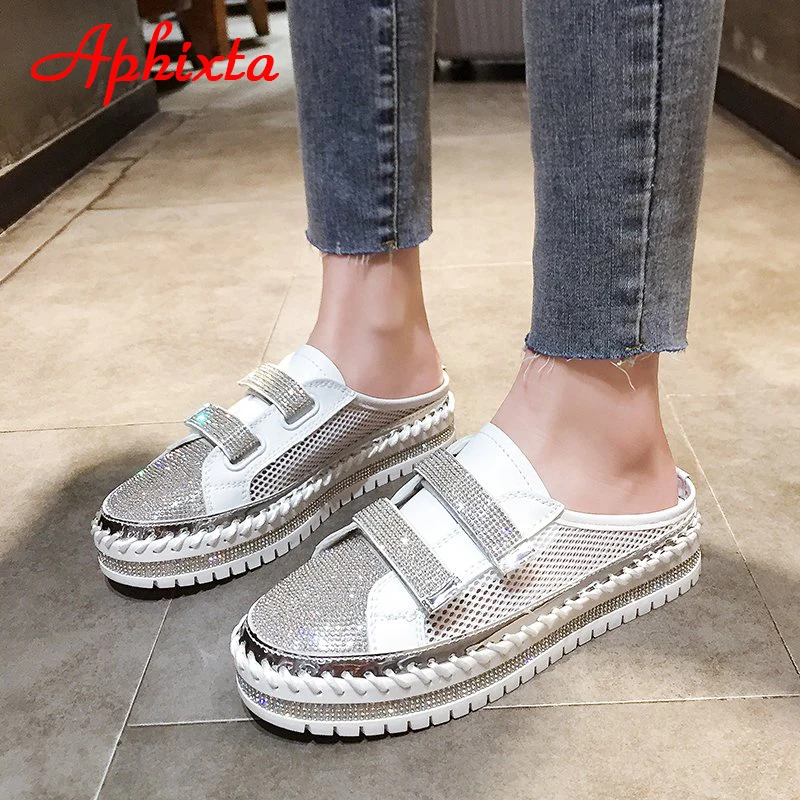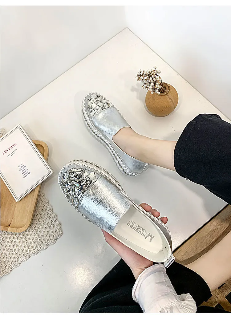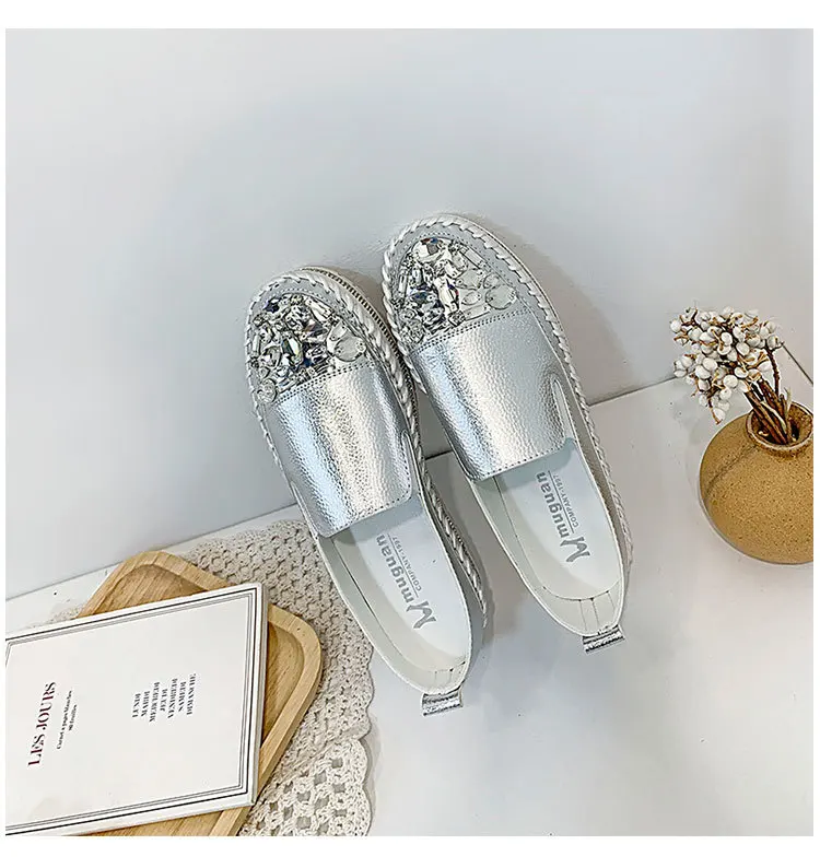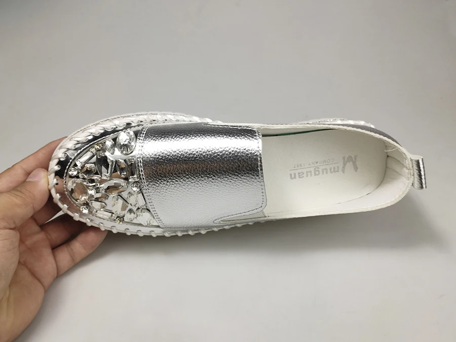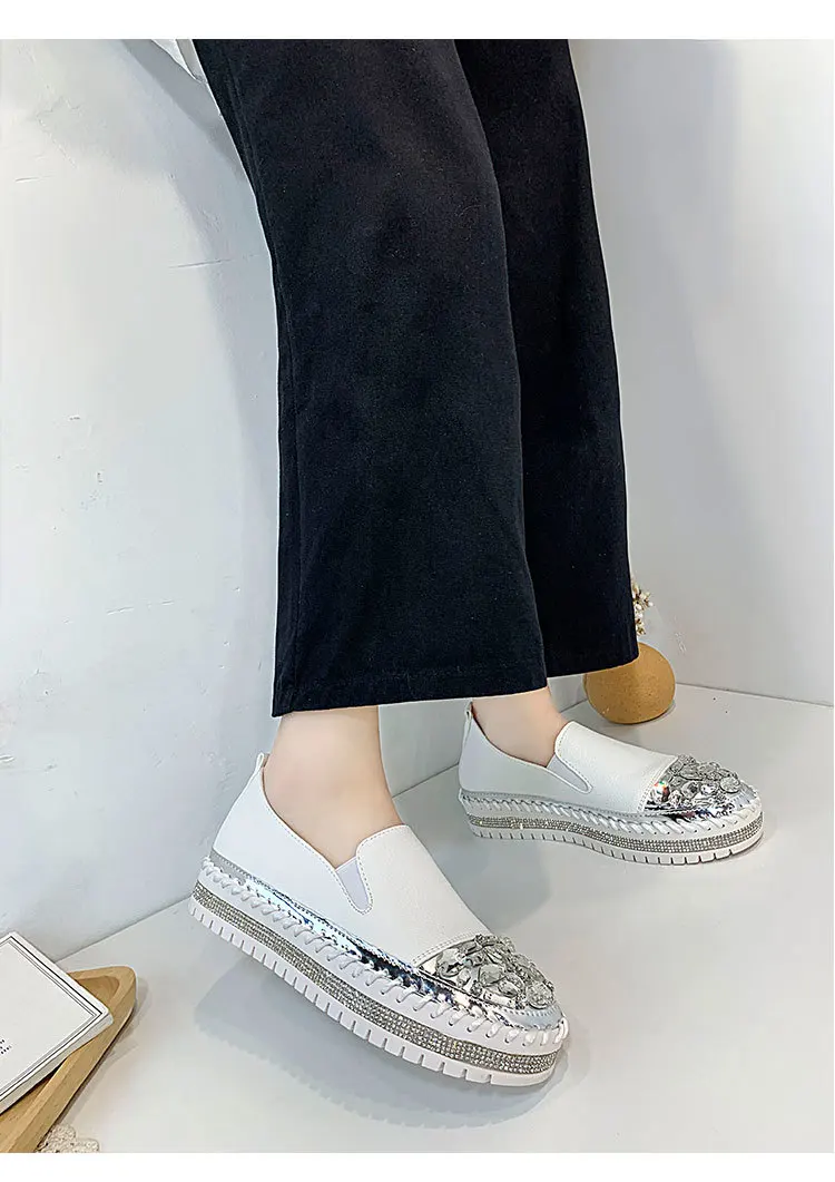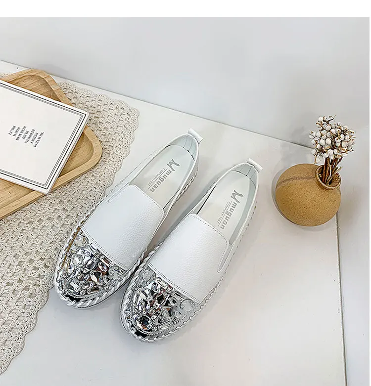 Женские кожаные туфли на плоской подошве Aphixta, серебристые лоферы с кристаллами, с круглым носком, на платформе, размер 43