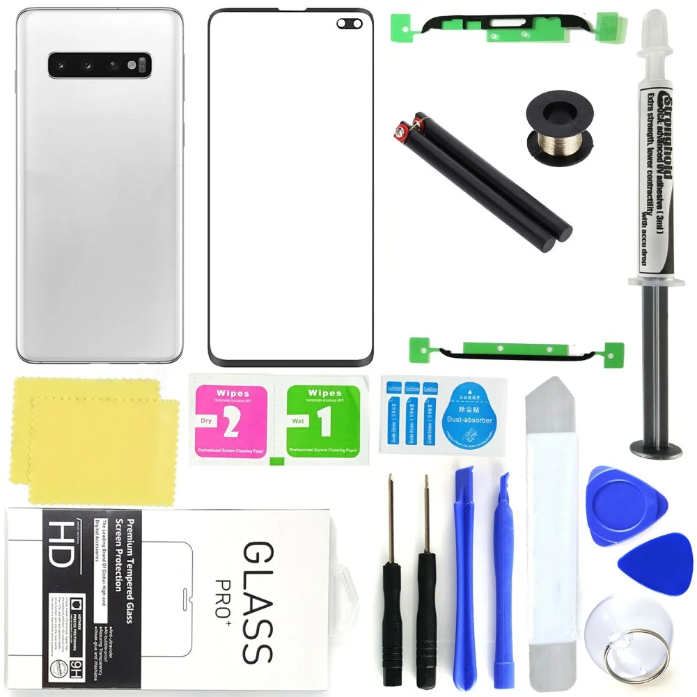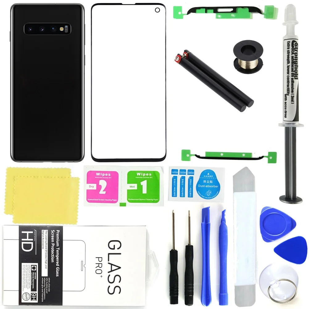 Запасной комплект для ремонта переднего стекла для Samsung Galaxy S10 Plus Технические характеристики: Он специально разработан для Samsung Galaxy S10/S10 Plus. Используется для замены поврежденных или изношенных частей на ваш мобильный телефон. Полный набор инструментов поможет вам безопасно открыть телефон, не повреждая крышку. Наименование товара: комплект передней и задней экранов Основные Материал: Стекло Совместимые модели: Для Samsung Galaxy S10 Для Samsung Galaxy S10 Plus Особенности: запасные части, точные, аксессуары для телефона, с инструментами Примечания: Эта часть предназначена только для замены внешнего стекла, рекомендуется Профессиональная установка. Если вы попытайтесь починить это самостоятельно, вы делаете это на свой собственный риск. Благодаря светильник и экрана Цвет Товара может быть s светильник ly отличается из-за характеристик монитора компьютера. Посылка включает в себя: (телефон не входит в комплект) 1x3 мл LOCA Клей 1 x рамкой лента 1 Набор инструментов для ремонта (8 шт.) 1 х передний стеклянный экран Задняя крышка для телефона-1 шт. 1 x инструмент для удаления ЖК-стекла 1 х пленка из закаленного стекла