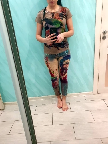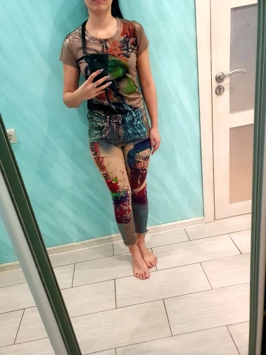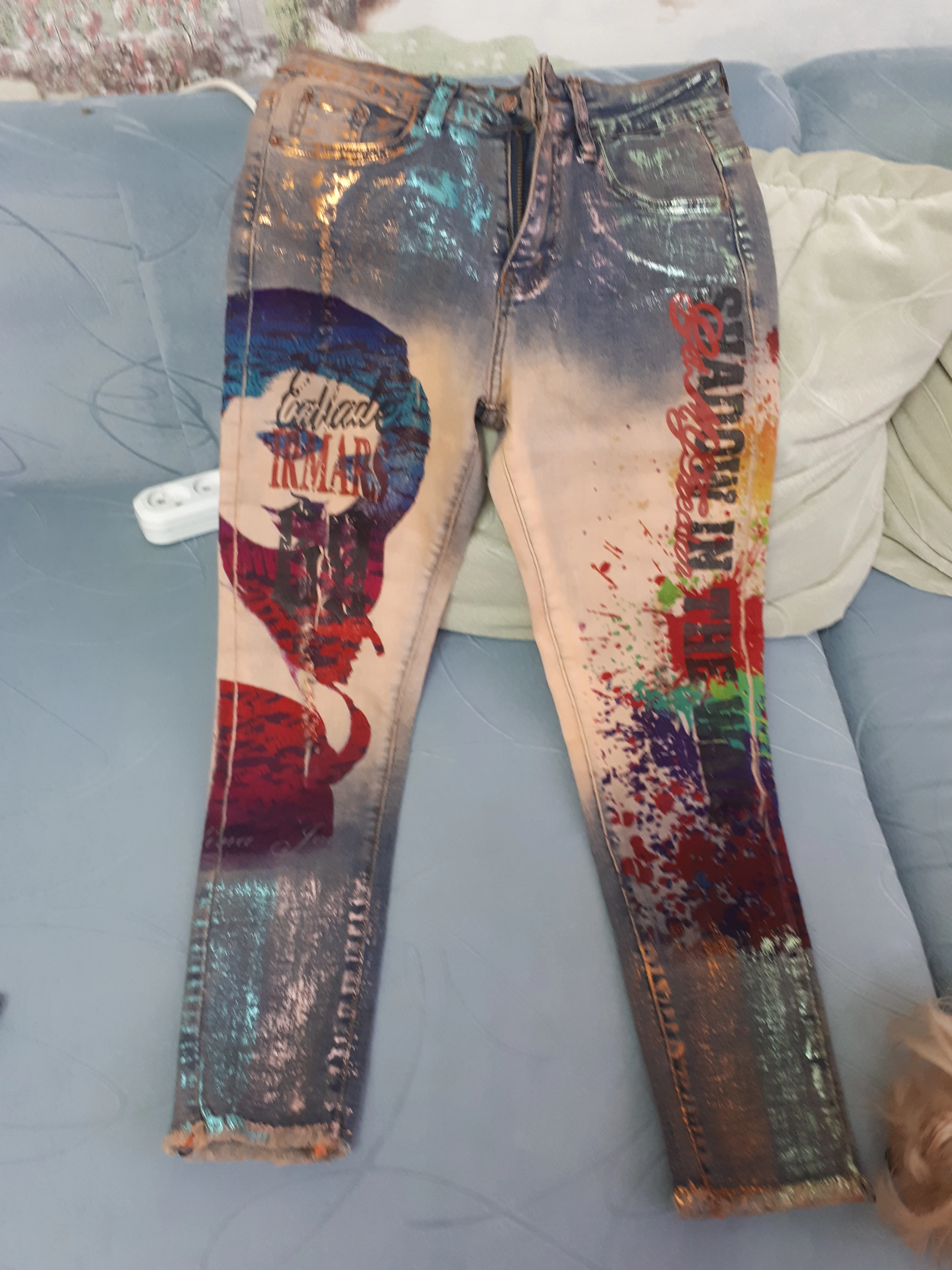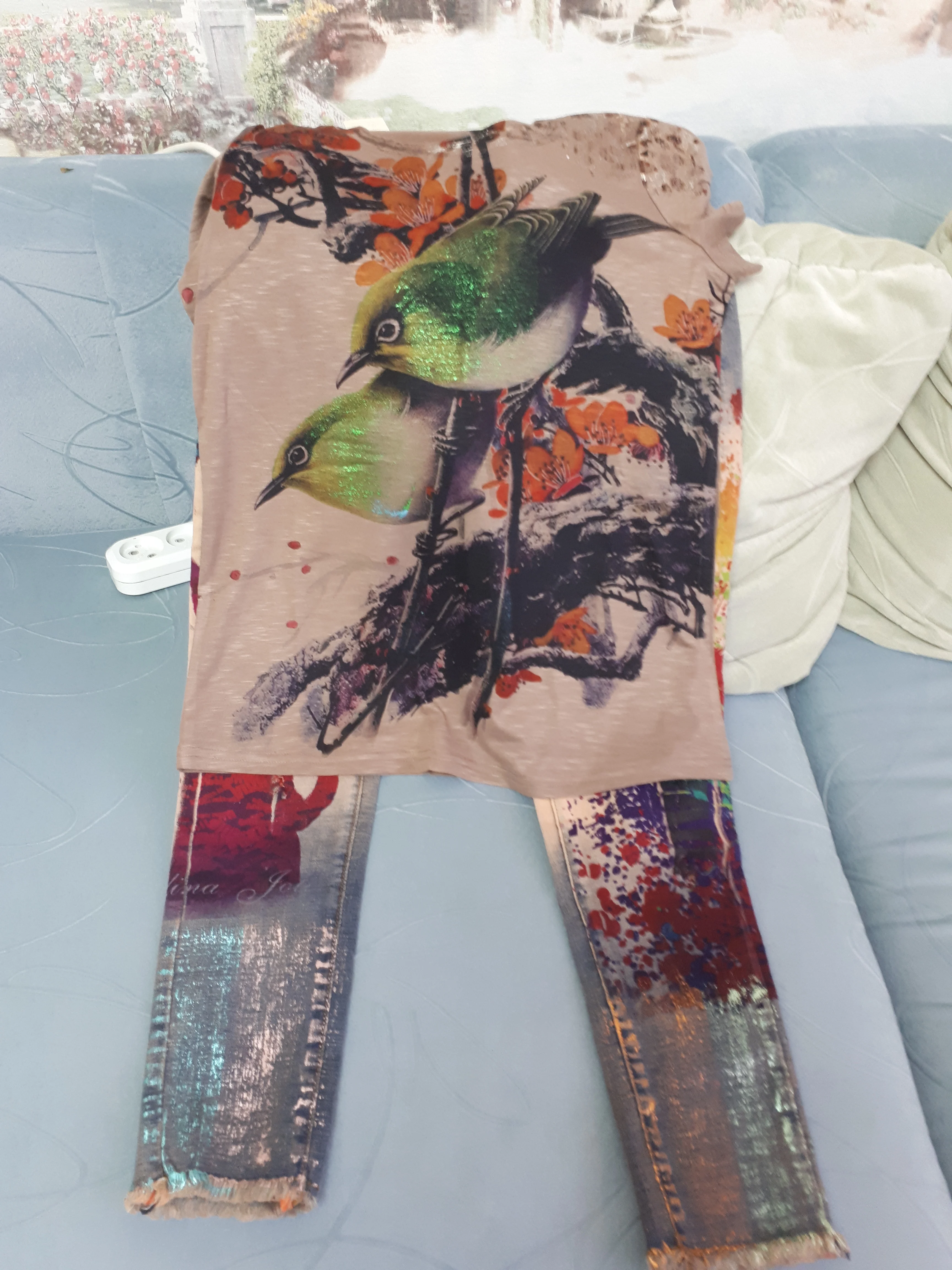 Офигенный комплект ! Смотрится очень дорого . Футболка плотная , приятная , принт четко пропечатан , швы ровные без ниток . Джинсы плотные со стрейчем, швы ровные , очень добротные , талия высокая . Размер s на рост 157 ОГ 83 ОТ 66 ОБ 93 сел прекрасно ( джинсы прекрасно сядут и на талию до 70 и бедра 96) Это одна из лучших покупок на Али