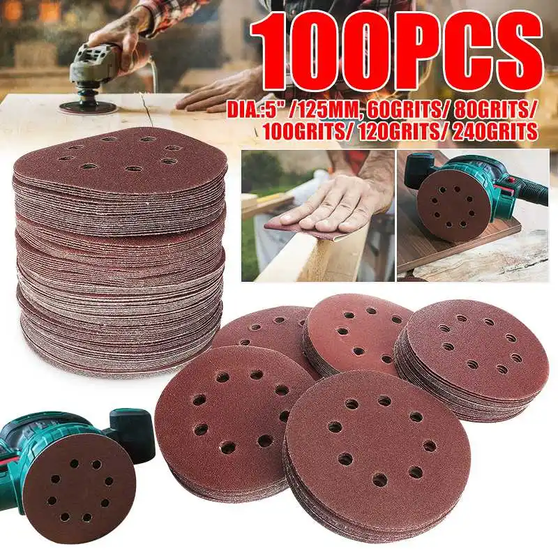 Листы шлифовальных дисков 125 мм 5 дюймов, 60, 80, 100120, 240 зернистая наждачная бумага, 8 отверстий, орбитальная шлифовальная машина упаковке по 100 шт.
