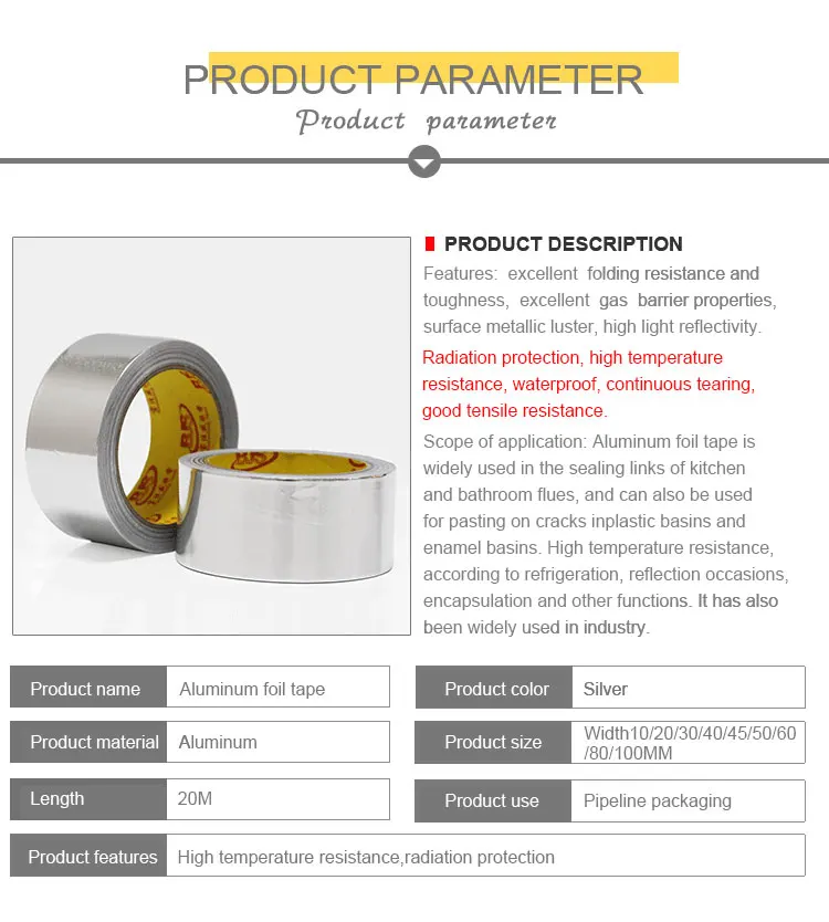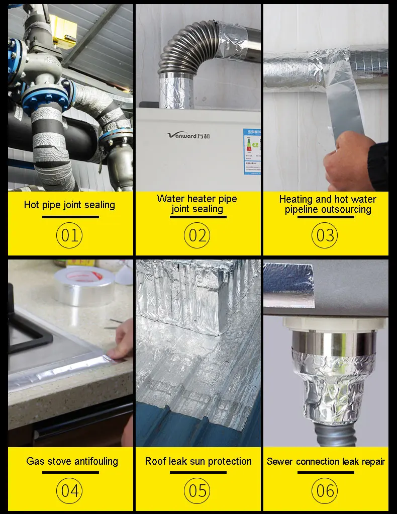 Область применения: лента из алюминиевой фольги широко используется для герметизации кухонных и санитарных дымоходов. Он также может быть использован для пластиковых горшков, эмалированных горшков, ламп с трещинами, высокой термостойкостью, в зависимости от охлаждения, случаев отражения, инкапсуляции и других функций, также полученных в промышленности. Широкое использование
